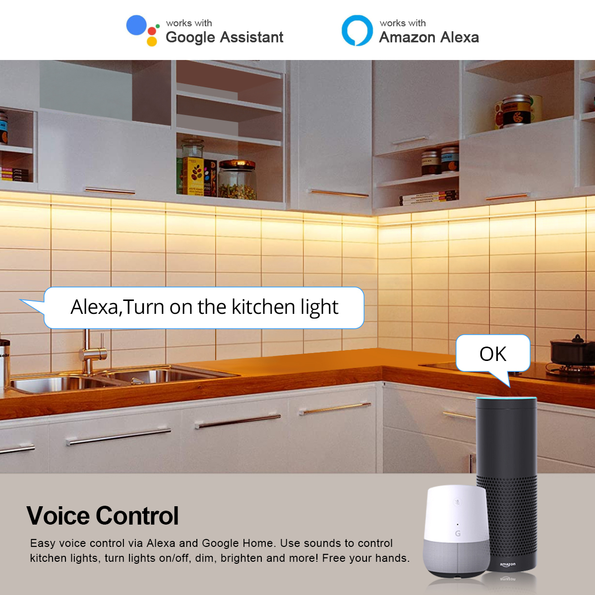 [Voice control] Use Google Assistant to control your smart light bar by voice. Just issue a voice command to turn on/off or dim/lighten the lights, or even switch the lights to specific colors as needed. No hub required, easy to install, no subscription required.