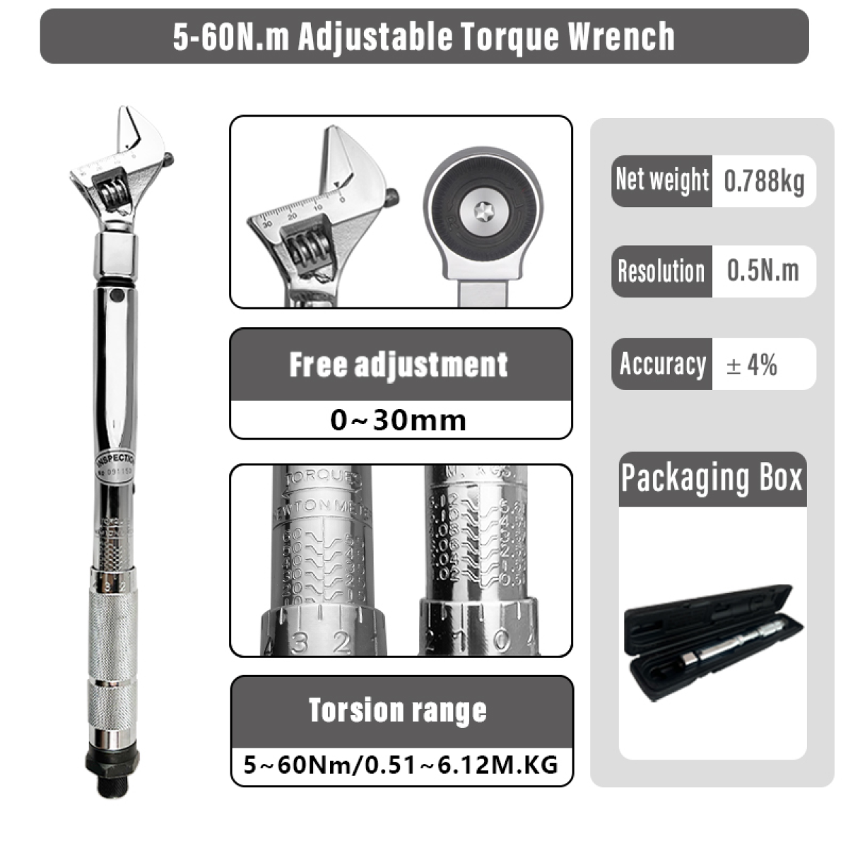 Convertible head design: The wrench head has a replaceable function, and the wrench opening can be freely adjusted between 0-30mm, making it easy to adapt to different specifications of bolts and nuts, greatly improving the tool's versatility and applicability.