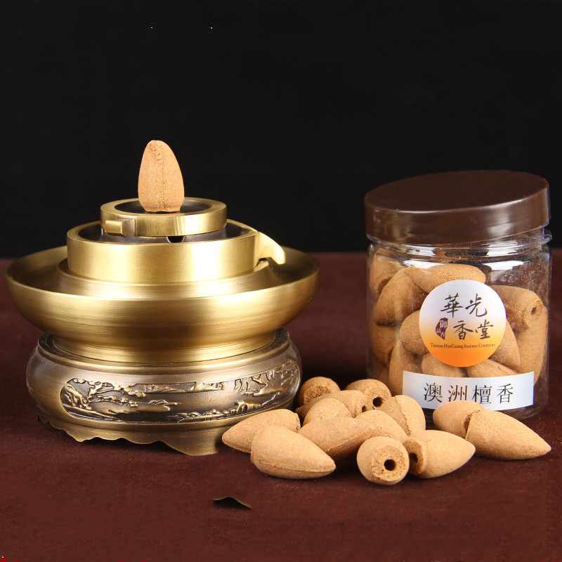 C: Copper backflow incense burner + a box of backflow incense + wooden base: Sandalwood: A single diameter of about 1.5cm and a height of about 2.6cm, with a box total weight of about 37 pieces of backflow incense burner: A diameter of about 11cm and a height of about 5.5cm