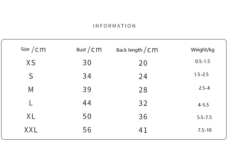 Note: Body weight is for reference only. It is recommended to measure the bust circumference. It is normal for manual measurement to have 2-3cm error