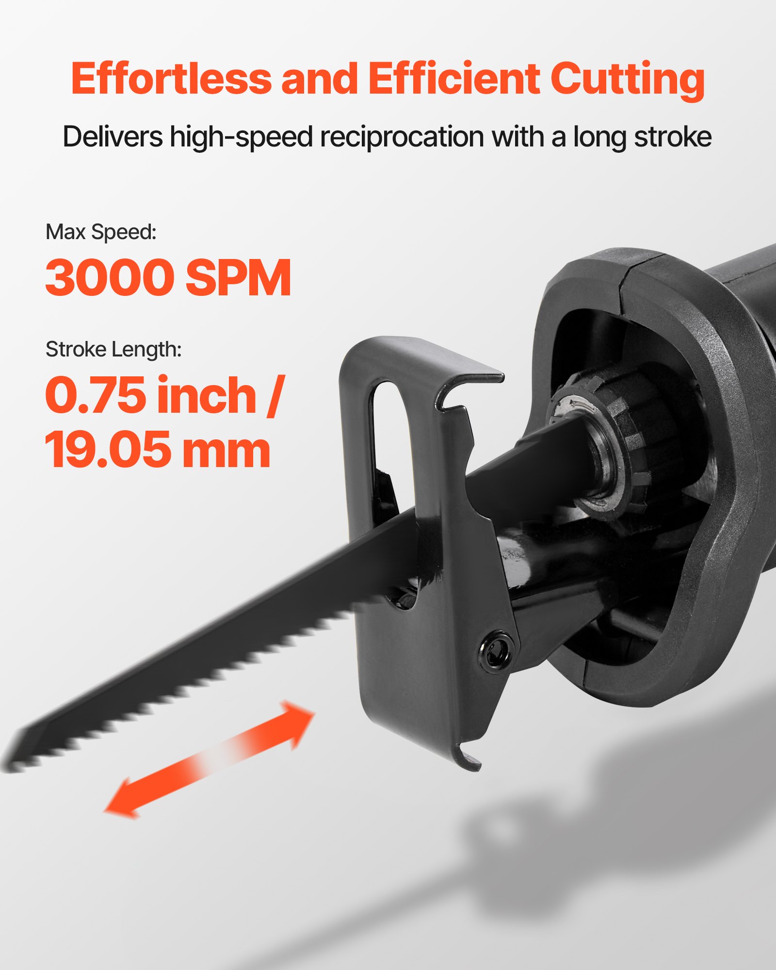 High-Efficiency Cutting: This reciprocating saw delivers up to 3000 SPM speed and a 0.75 in / 19.05 mm wide stroke for 4.53 in / 115 mm max wood depth (0.315 in / 8 mm in metal), making thick cuts fast and efficient