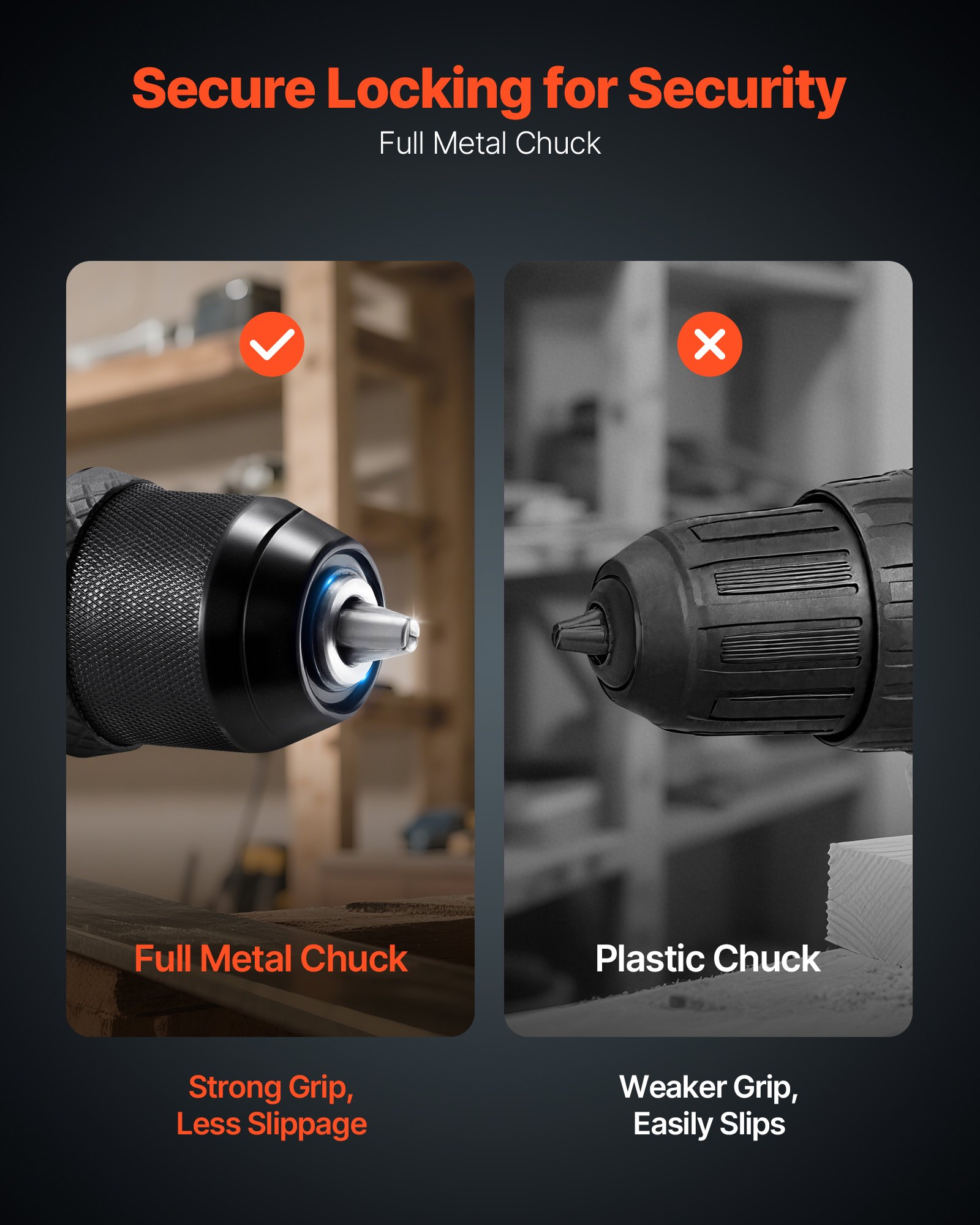 All-Metal Chuck: More durable than plastic chucks, the full-metal chuck firmly holds drill bits and driver bits for high-speed tasks and heavy loads. Our battery operated drill ensures stability and boosts work efficiency