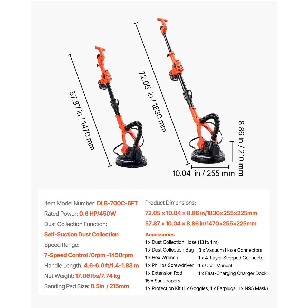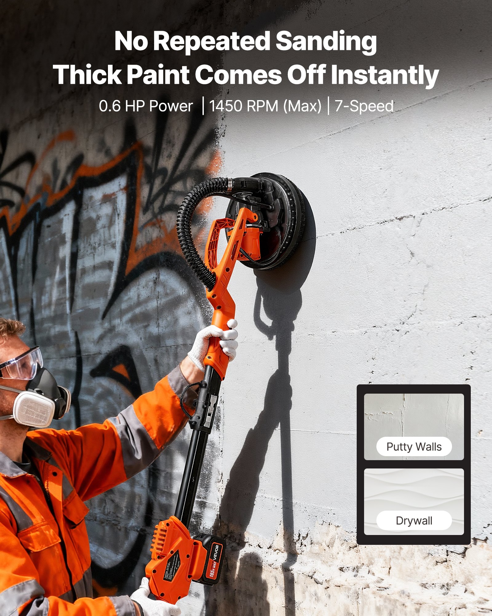 0.6 HP Powerful Motor: This drywall sander comes with a robust motor delivering up to 1600 RPM with 7 adjustable speeds. Ideal for walls, floors, and ceilings, it handles thin putty, thick paint, and aged surfaces with smoother, more effortless sanding