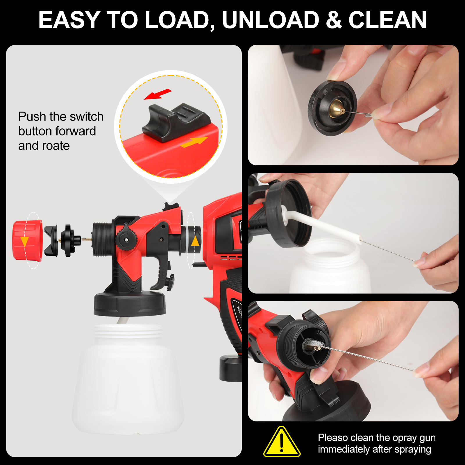 Easy to install and clean: The paint spray gun is easy to install and has a one-touch disassembly button on the top, which can be quickly installed and disassembled without tools. After spraying, you can use the matching brush and needle to clean the nozzle, which is easy to operate (Note: the motor is strictly prohibited from being washed with water)