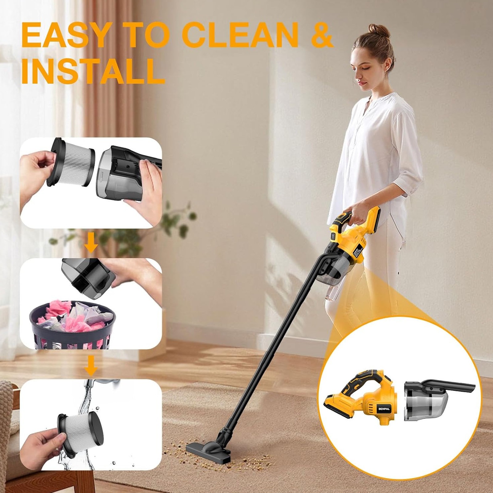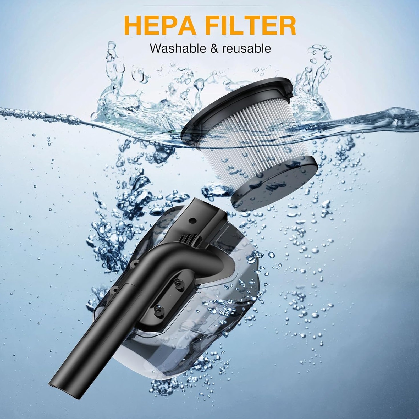 All-Round Cleaning, No Missing Corners: Light as a feather,hard as a stone,Even if you need to use this vacuum cleaner to clean a high place.This cordless handheld vacuum includes one high-quality washable HEPA Filters that are easy to maintain, install, and are washable and reusable, guaranteeing lasting value