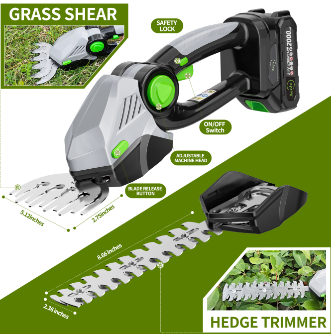 【PROFESSIONAL 2-IN-1 TOOL】Aenlv cordless trimmer includes quick blade release for easy switching. The 5.11" short blade trims lawns and grass patches, while the 8.67" long blade handles hedges, shrubs, and small branches. One tool meets all your basic garden trimming needs.
