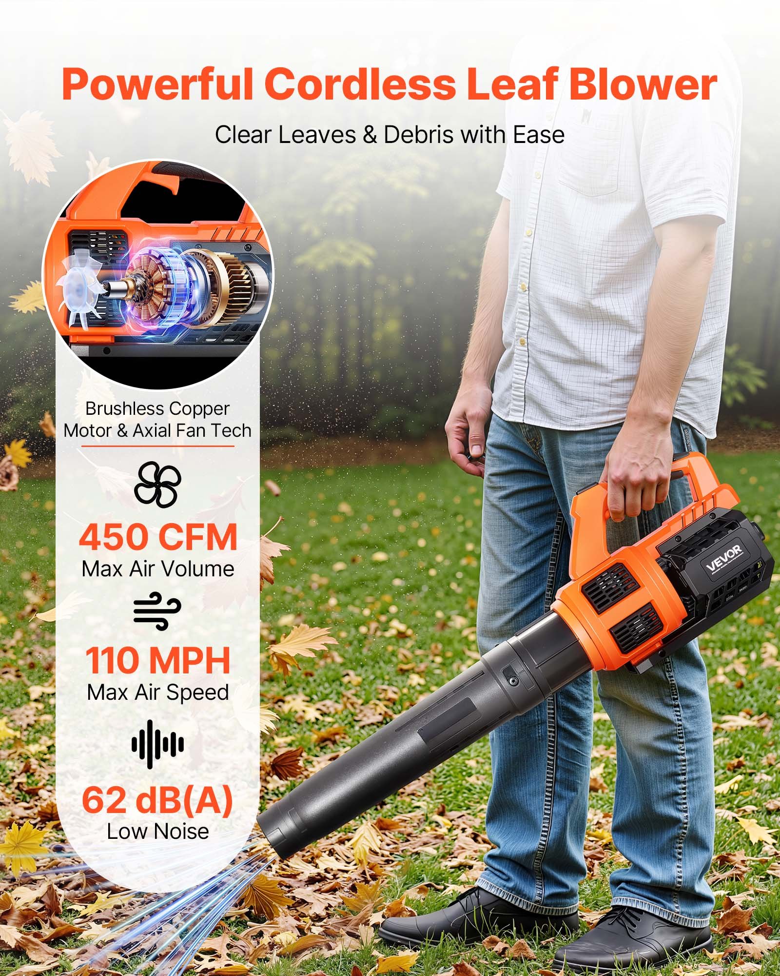 Powerful Motor: The cordless leaf blower features a brushless copper motor and axial fan technology, delivering up to 450 CFM airflow and 110 MPH airspeed. Effortlessly clears leaves, debris, and even small gravel with low noise at just 62 dB(A), ensuring efficient yet quiet operation
