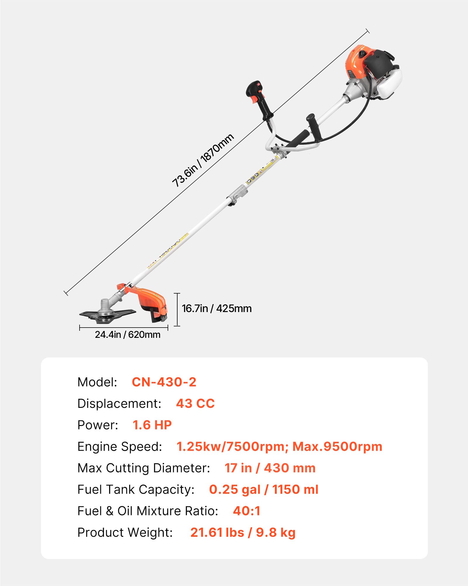 High-Performance Power: Powered by a 43 cc two-stroke engine, this cordless string trimmer delivers 1 HP and reaches speeds of up to 7500 rpm. It handles a wide range of grass types quickly and efficiently, improving work efficiency