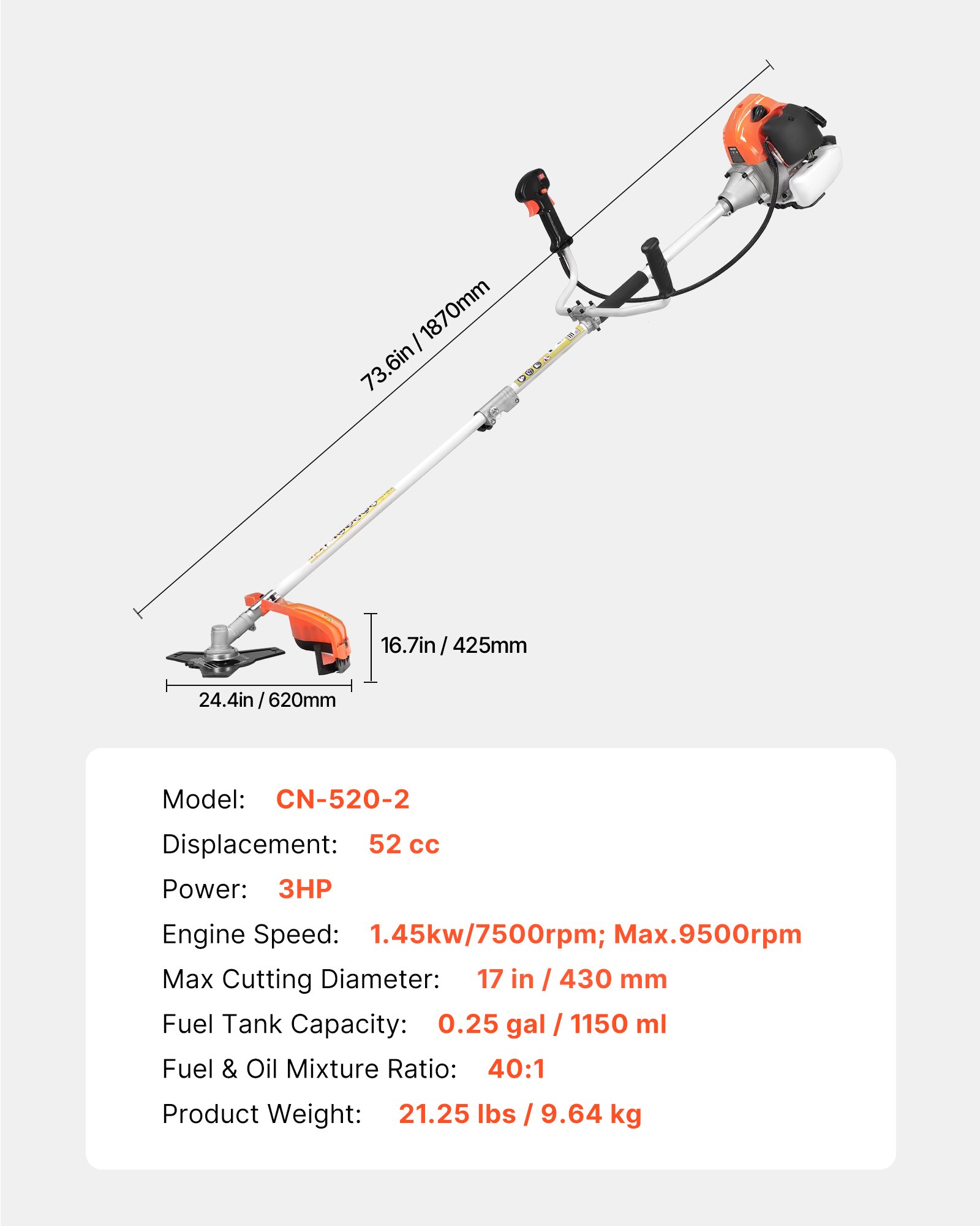 High-Performance Power: Powered by a 52 cc two-stroke engine, this cordless string trimmer delivers 1 HP and reaches speeds of up to 7500 rpm. It handles a wide range of grass types quickly and efficiently, improving work efficiency
