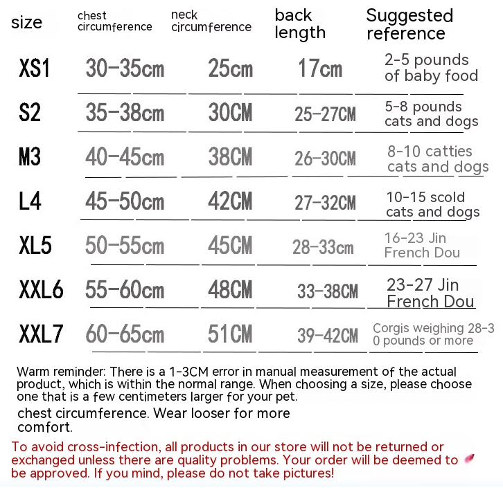 Size: S2 (2.50kg-4.00kg dogs and cats),M3 (4.00kg-5.00kg dogs and cats),L4 (5.00kg-8.50kg dogs and cats),XL5 (9.00kg-11.00kg Jarre Aero Bull and other medium dogs),2XL (11.50kg-14.50kg Jarre Aero bull corgi),3XL (14.50kg-17.50kg Jarre Aero bull corgi)