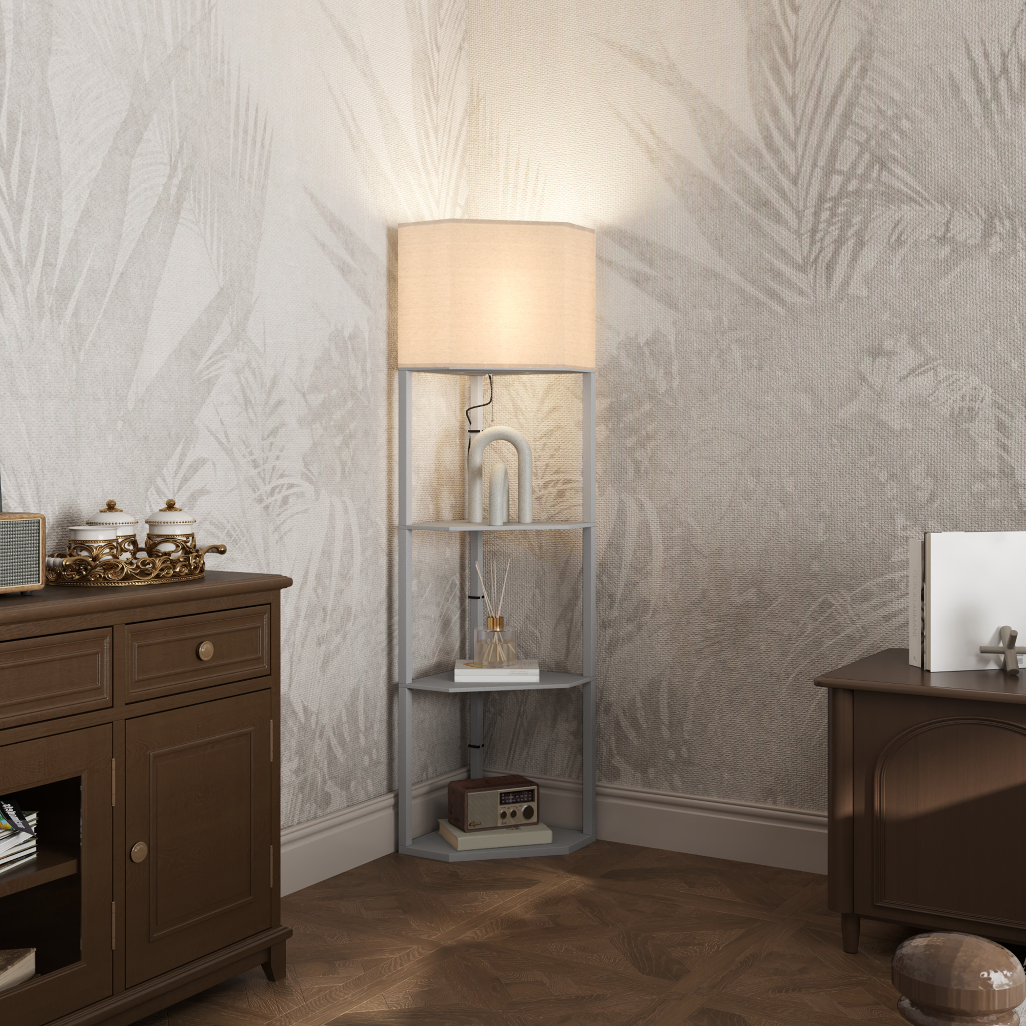 Corner Floor Lamp With Shelves, Tall Standing Lamps For Living Room, With Pull Chain Switch Bulb Not Included, Grey