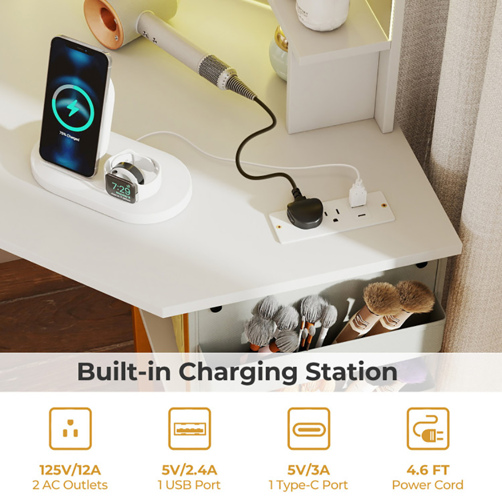 • Keep Your Devices Charged: The vanity table is designed with a charging station with 2 AC outlets, 1 Type-C Port, and 1 USB port. You can conveniently charge your phones, hair dryers, beauty tools, and more.