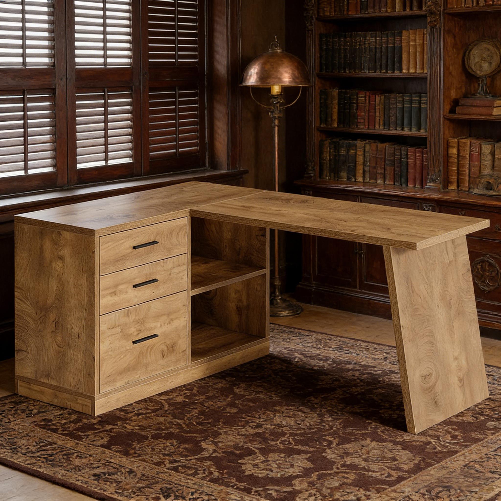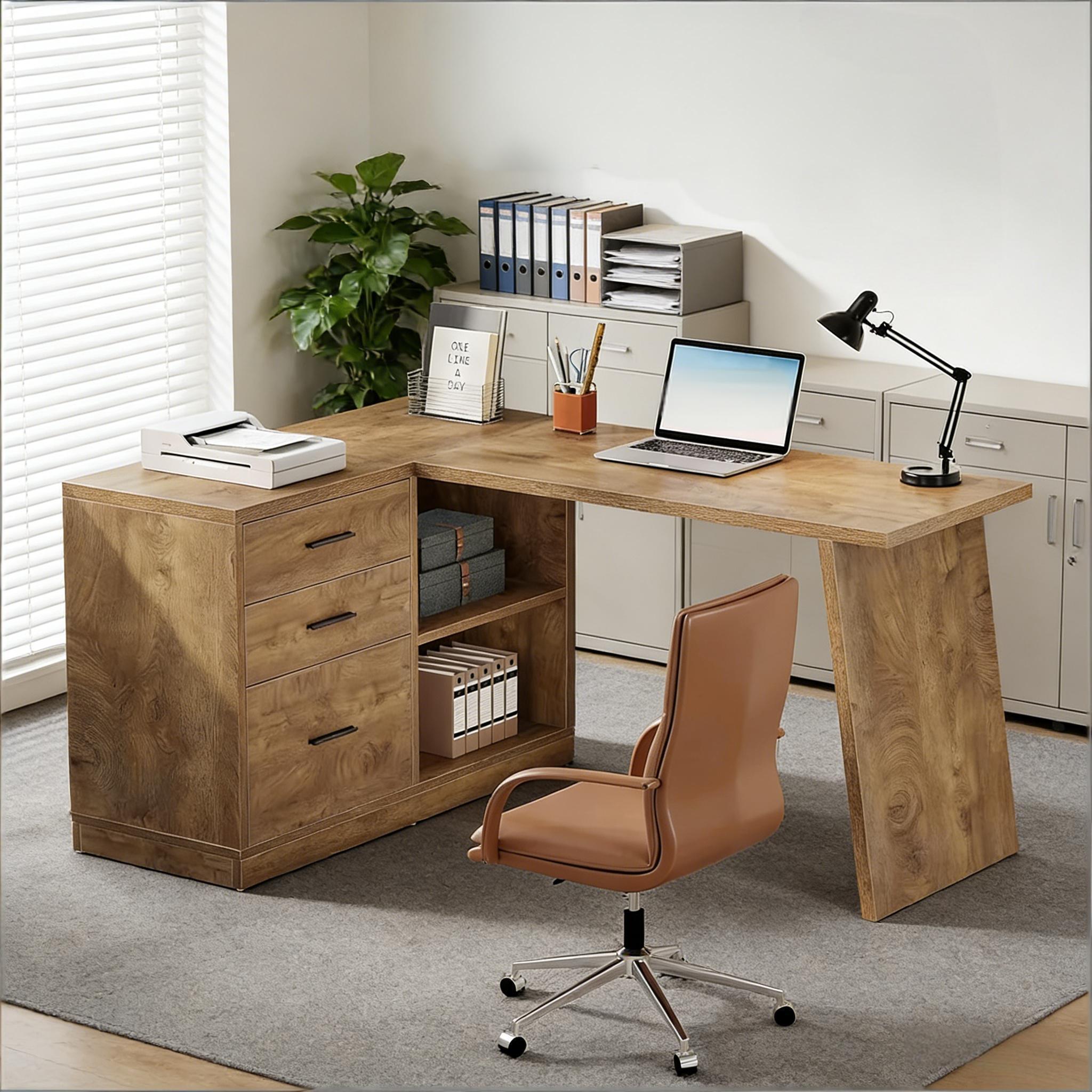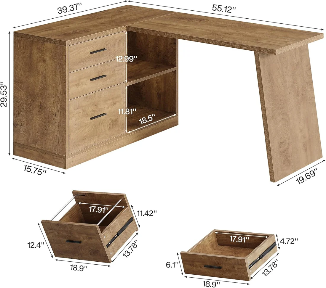 Important Reminder!!! 1) Attention: All products in our store do not support Canada self pickup ordering. Please do not create shipping labels for Canada. Our American products do not support self pickup to Canada 2)We do not ship to Alaska, Hawaii, US protectorates (e.g., Puerto Rico), P.O. boxes, or APO/FPO addresse 3)We don’t accept non-defective remorse returns Sophisticated Design - Boasting a classic brown finish, this L-shaped desk features a sleek corner design with high-quality joinery. It presents an elegant and welcoming appearance for your workspace and serves as a refined addition to your home furniture. Sturdy Build - Constructed from premium MDF, this L-shaped desk can comfortably support all-in-one computers and other office essentials. Additionally, its adjustable feet ensure stability, even on uneven surfaces. Efficient Storage - Enhance your efficiency with three drawers and two open shelves providing ample space for office supplies. With a height of 29.5'', this desk ensures you have plenty of legroom to stretch out comfortably. Large Working Area - This corner desk offers two work surfaces for multiple monitors, laptops, and accessories. The thoughtful design caters to comfort, especially during long work hours. Hassle-Free Assembly - With clear instructions, numbered parts, and all necessary tools included, this office desk can be assembled easily. For any inquiries, our customer-friendly service team is ready to assist.