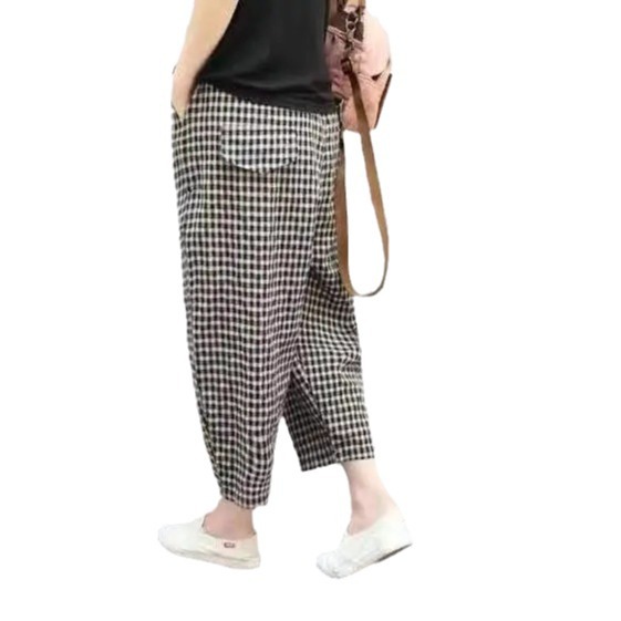 Cotton And Linen High Waist Harem Ankle-length Baggy Pants Artistic Plaid Loose Baggy Pants Women