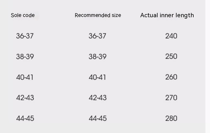 Sizes: 36-37 (suitable for 35-36 feet), 38-39 (suitable for 37-38 feet), 40-41 (suitable for 39-40 feet), 42-43 (suitable for 41-42 feet), 44-45 (suitable for 43-44 feet)