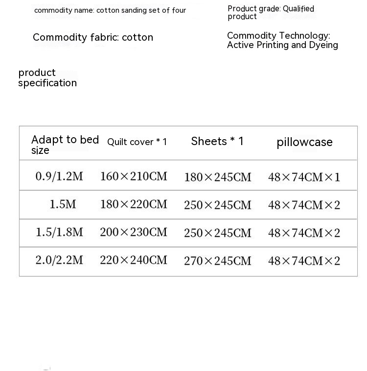 Size specification: 1.2m bed sheet three-piece set (quilt cover 160 * 210cm),1.5m bed sheet four-piece set (quilt cover 180 * 220cm),1.8m bed sheet four-piece set (quilt cover 200 * 230cm),2.0m bed sheet four-piece set (quilt cover 220 * 240cm)