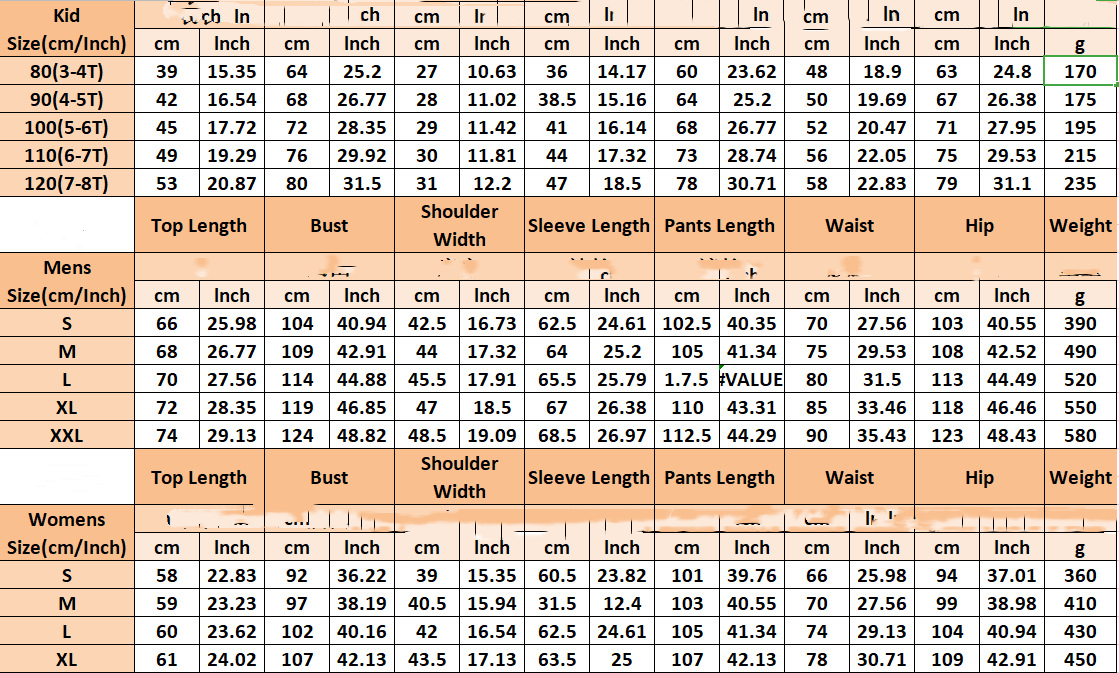 Size: S (Dad), M (Dad), L (Dad), XL (Dad), 2XL (Dad), S (Mom), M (Mom), L (Mom), XL (Mom), 80 (3T) -4T), 90(4T-5T), 100(5T-6T), 110(6T-7T), 120(7T-8T)