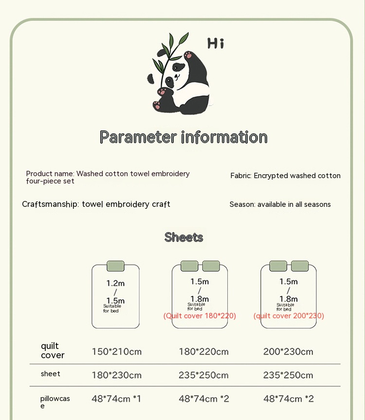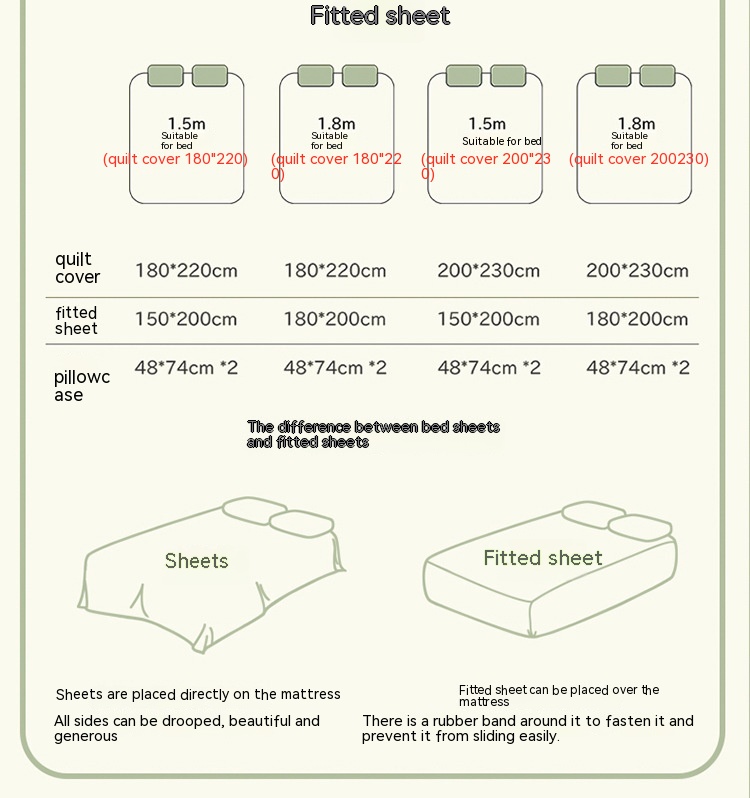 Size specification: 1.2m bed sheet three-piece set (quilt cover 150 * 210cm bed sheet 180*230),1.5m bed sheet four-piece set (quilt cover 180 * 220cm bed sheet 235*250),1.8m bed sheet four-piece set (quilt cover 200 * 230cm bed sheet 235*250),1.5m fitted sheet four-piece suit (quilt cover 180 * 220cm),1.8m fitted sheet four-piece suit (quilt cover 180 * 220cm),1.5m fitted sheet four-piece suit (quilt cover 200 * 230cm),1.8m fitted sheet four-piece suit (quilt cover 200 * 230cm)