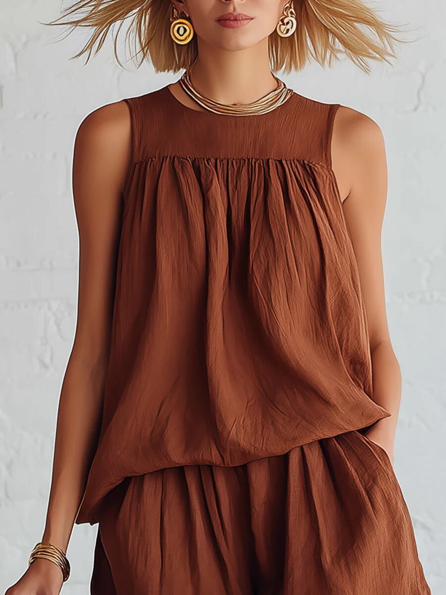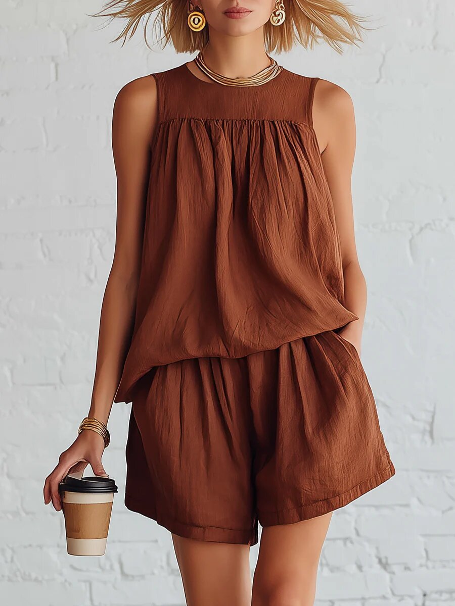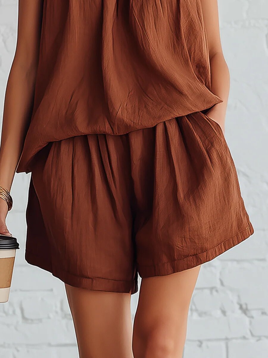 Cotton-linen Sleeveless Top And Wide-leg Shorts Set