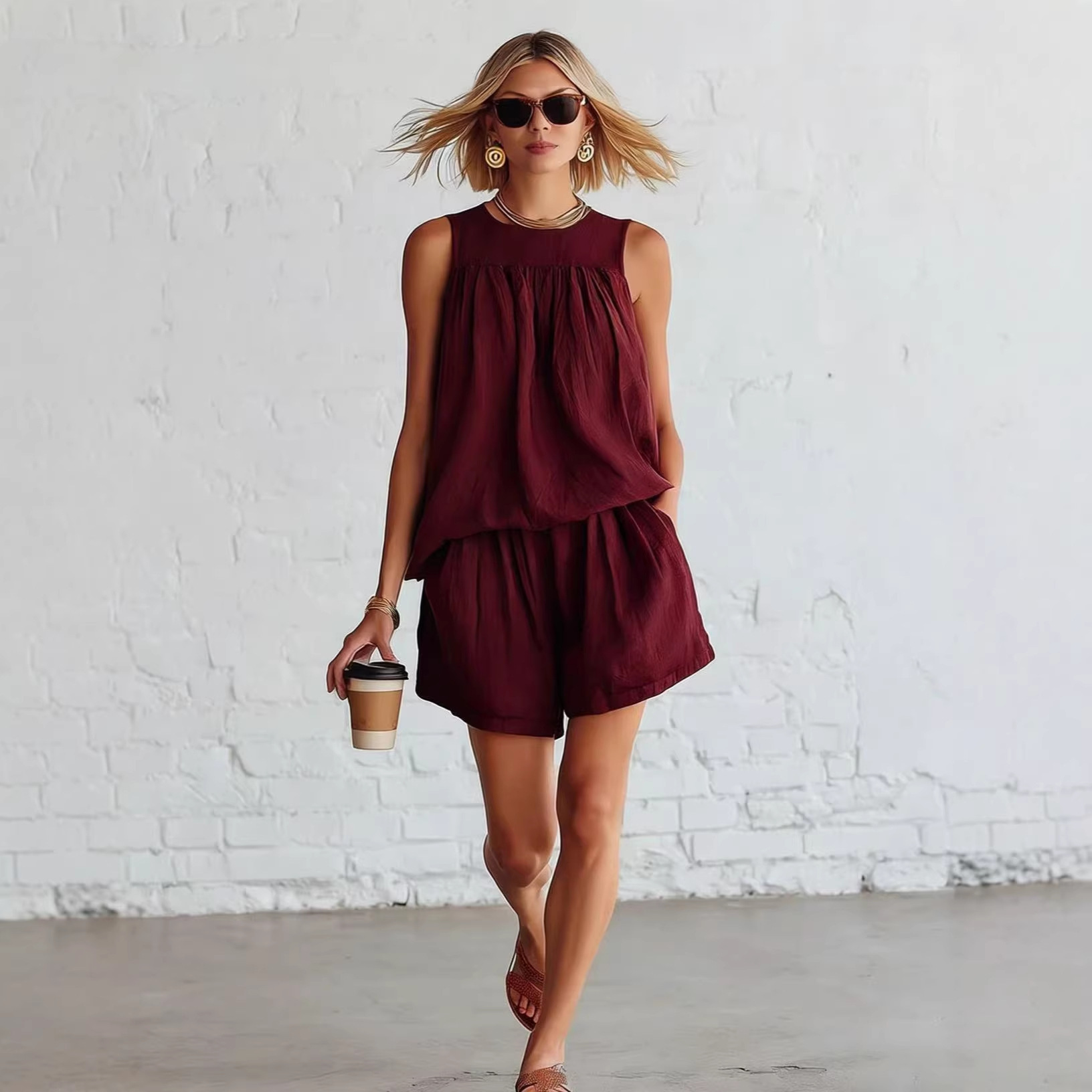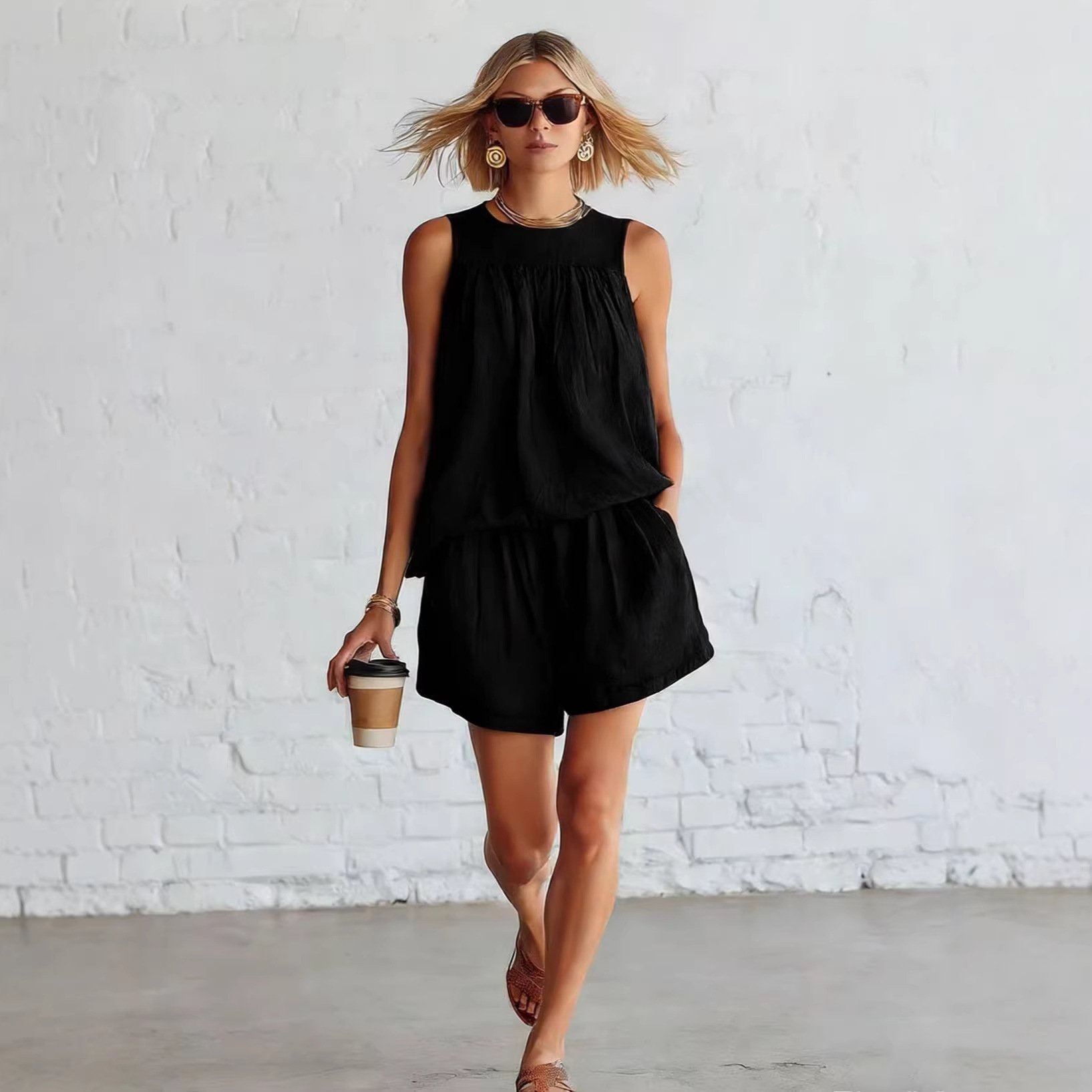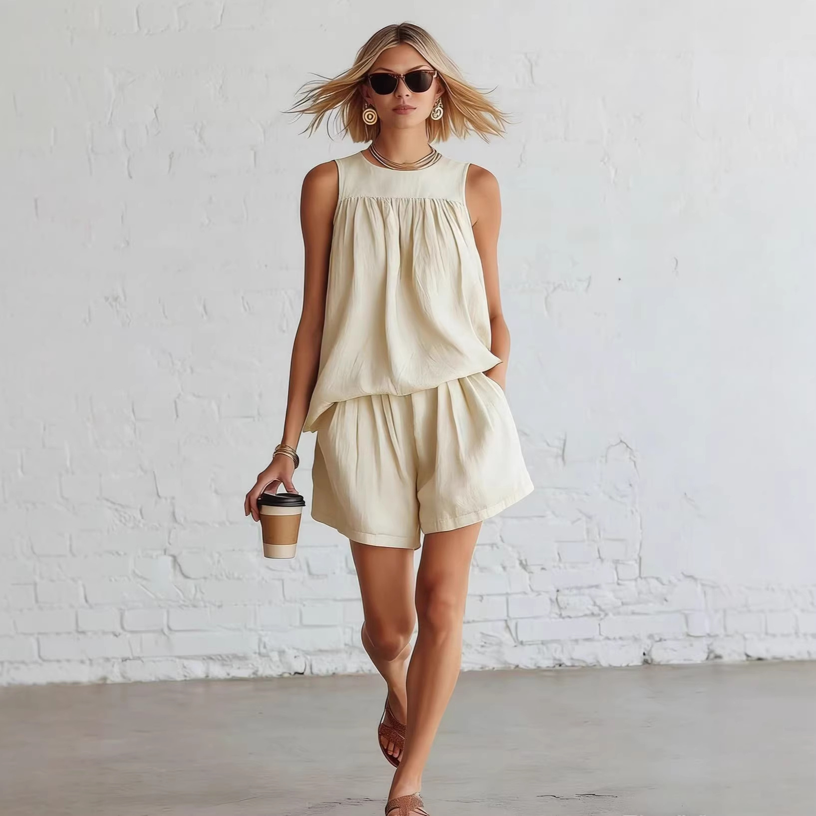 Cotton-linen Sleeveless Top And Wide-leg Shorts Set