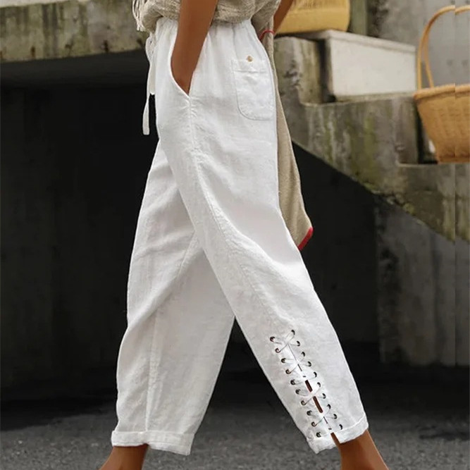 Cotton Linen Solid Color Pocket Sweet Stitching Casual Pants