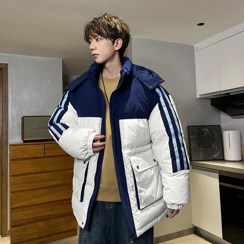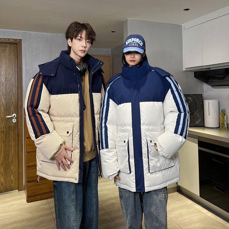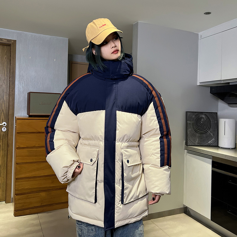 Cotton-padded Coat Large Striped Style With Pockets Color Matching