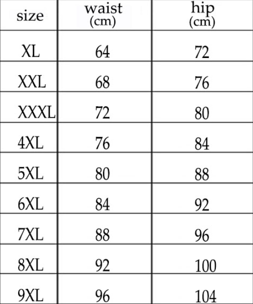 Size: XL, 2XL, 3XL, 4XL, 5XL, 6XL, 7XL, 8XL, 9XL