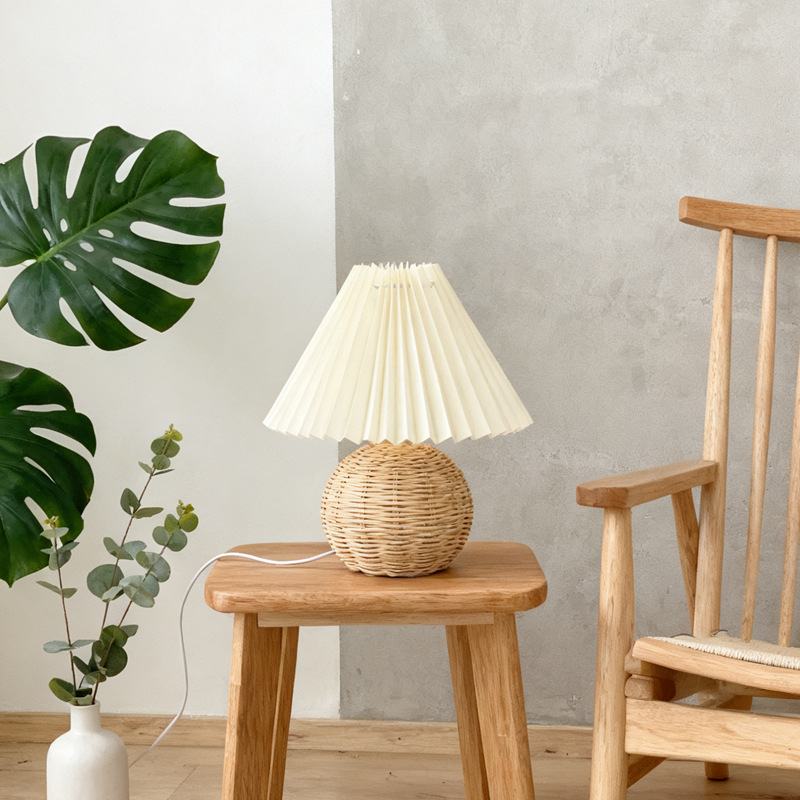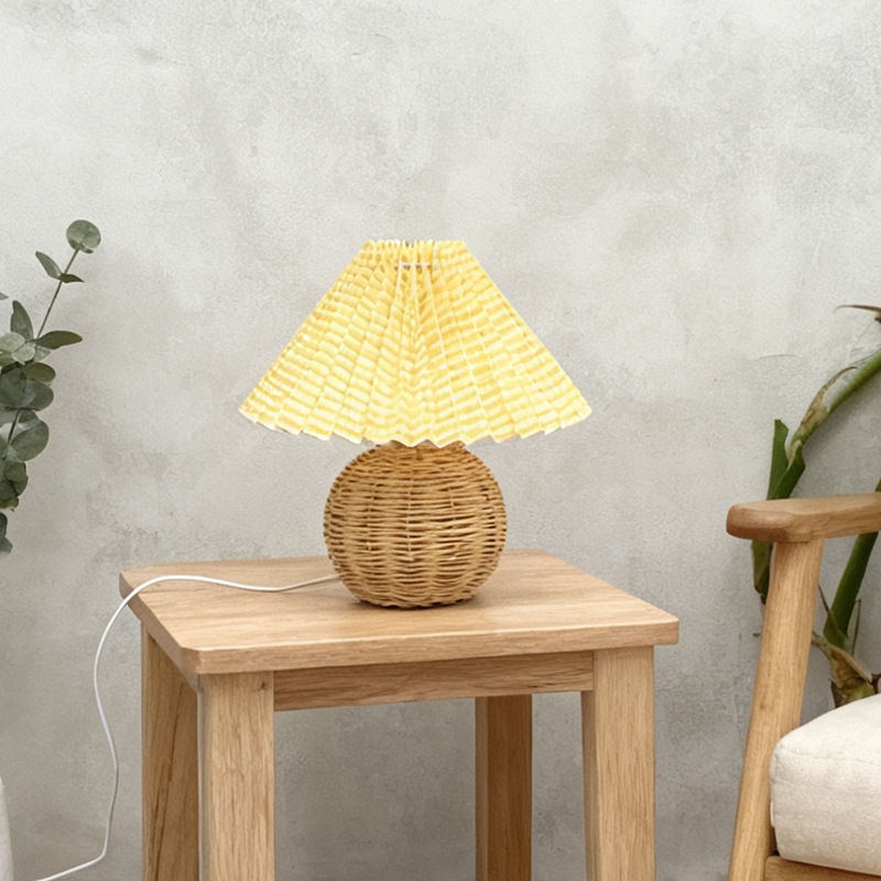 Dimensions: Floral pleated lampshade + rattan lamp body, yellow checkered pleated lampshade + rattan lamp body, off-white pleated lampshade + rattan lamp body, red pleated lampshade + rattan lamp body