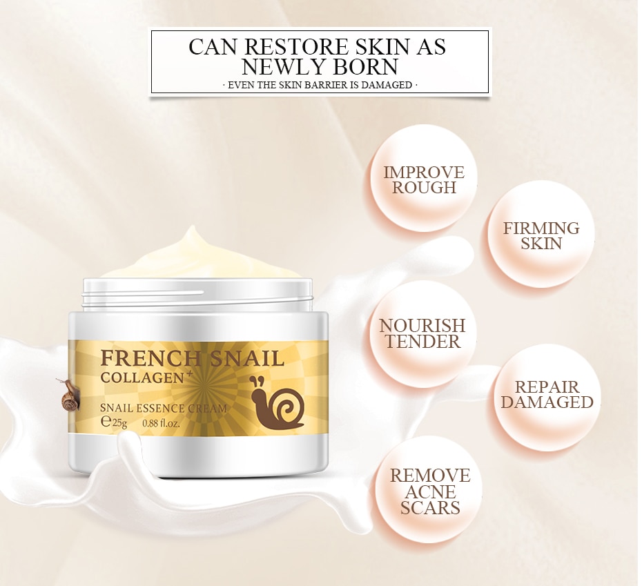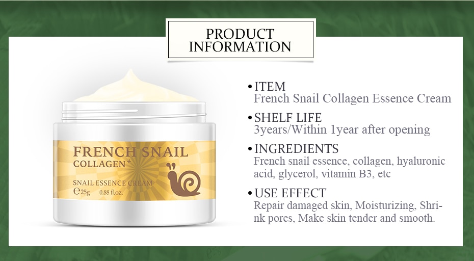 ●ITEM:French Snail Collagen Essence Cream ●SHELF LIFE:3years/Within lyear after opening ●INGREDIENTS:French snail essence, collagen, hyaluronic acid, glycerol, vitamin B3, etc ●USE EFFECT:Repair damaged skin, Moisturizing, Shri-nk pores, Make skin tender and smooth.