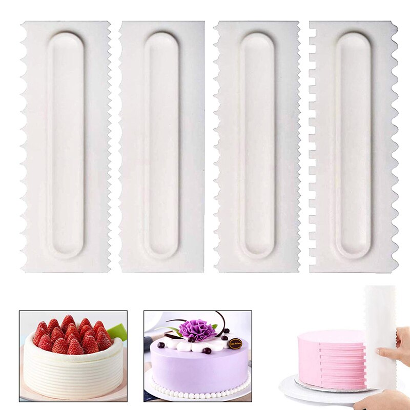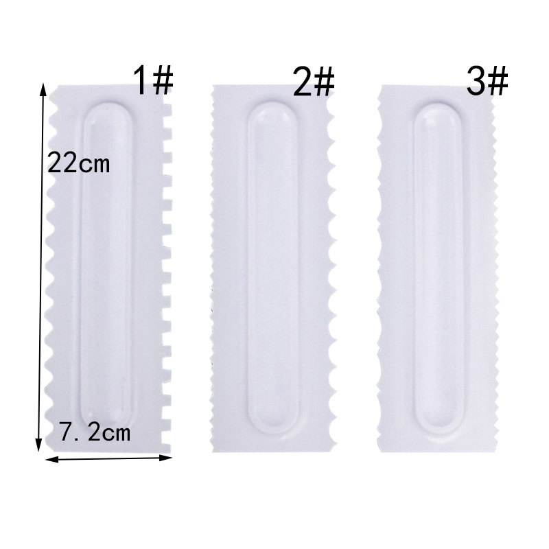Product name: 3 types of cream scrapersMaterial: food grade plasticcolor: WhitePurpose: Tool shape of fondant cake setSize: 22*7.2*0.9cm