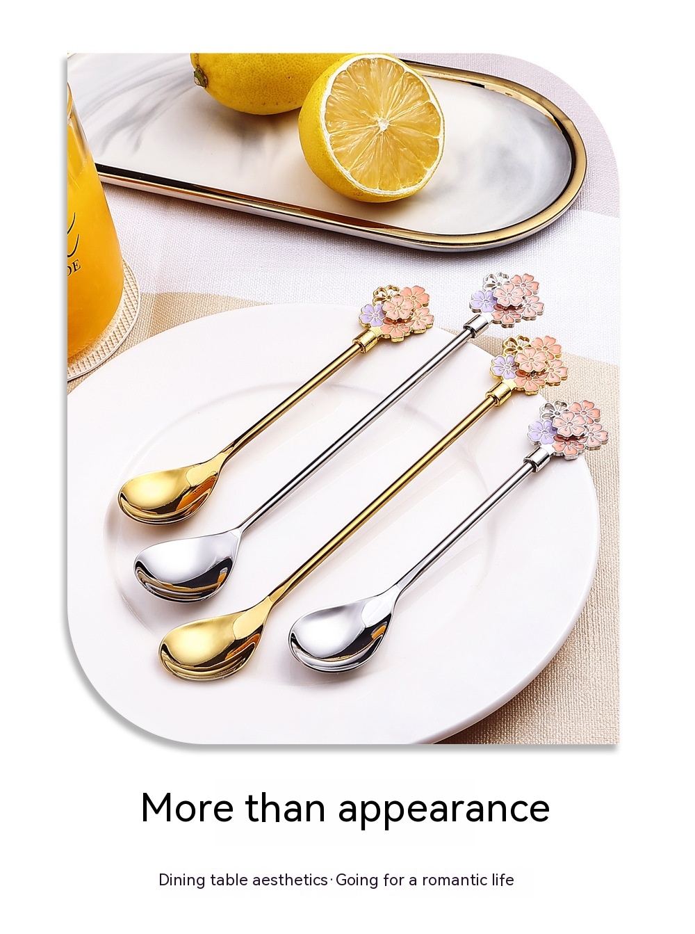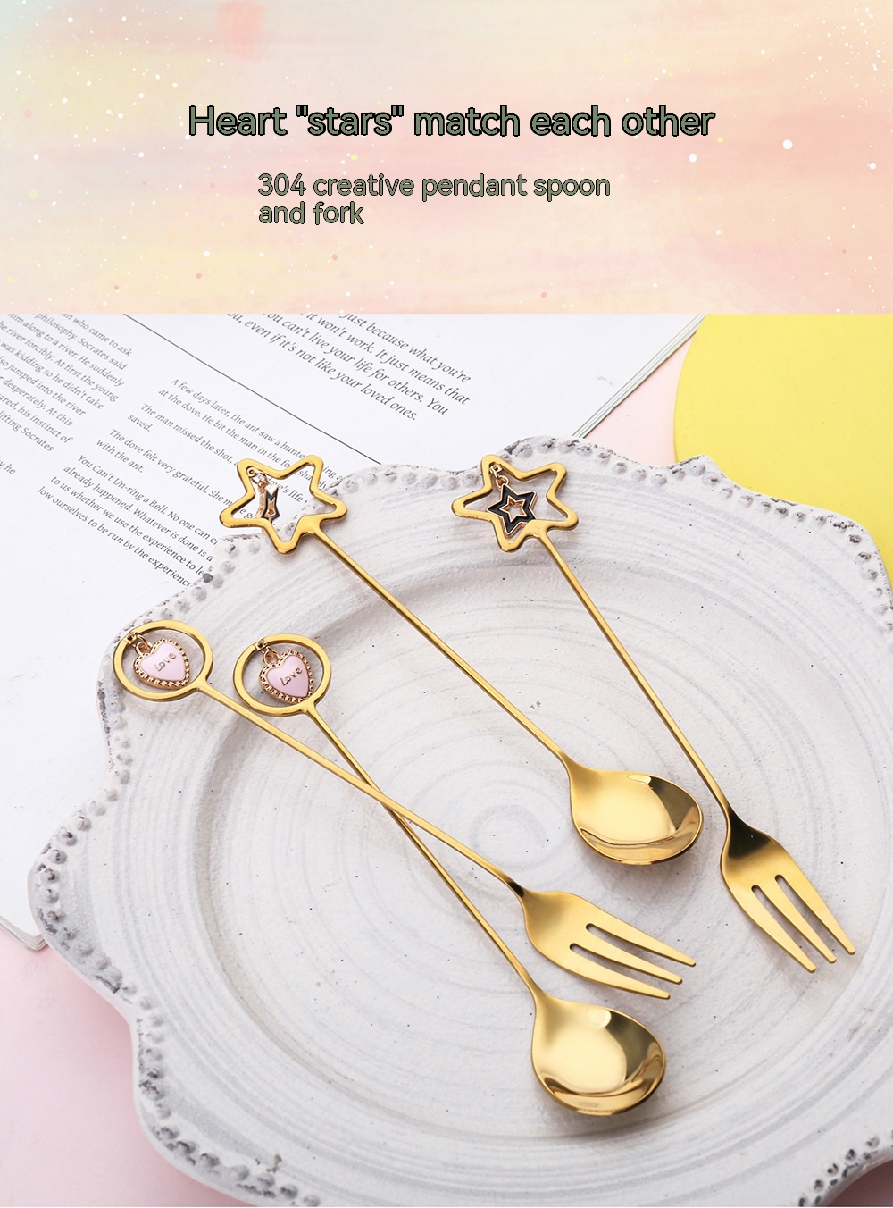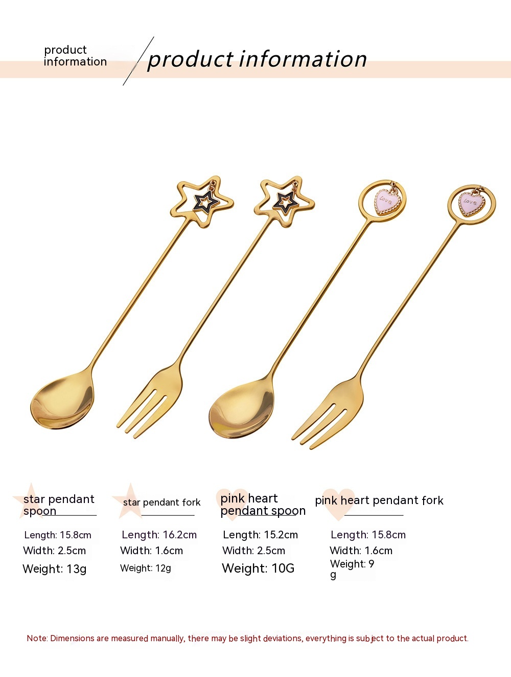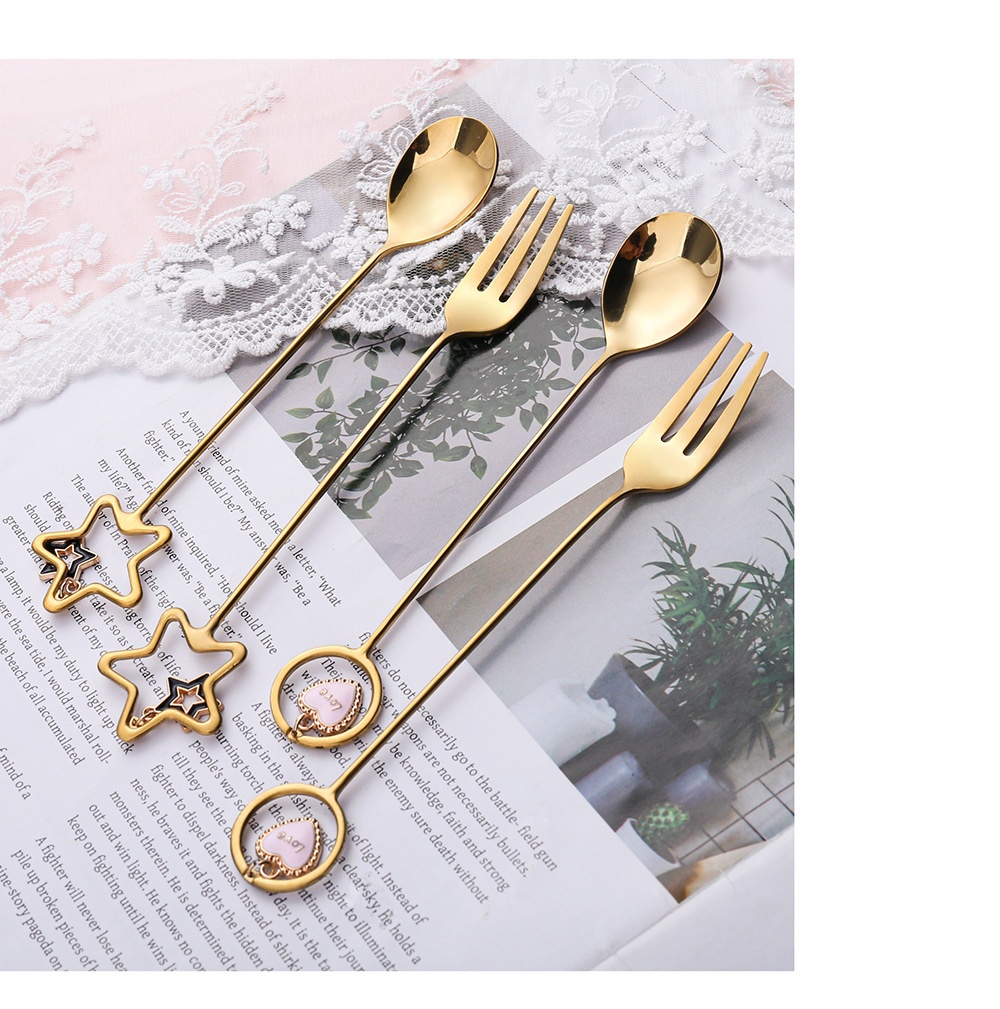 Specifications: 304 long handle cherry blossom spoon-gold, 304 long handle cherry blossom spoon-Silver, 304 short handle cherry blossom spoon-gold, 304 short handle cherry blossom spoon-Silver, 304 XINGX pendant spoon-gold, 304 XINGX pendant fork-gold, 304 round pendant spoon-gold, 304 round pendant fork-gold, 304 elk spoon-Silver, 304 elk spoon-Gold