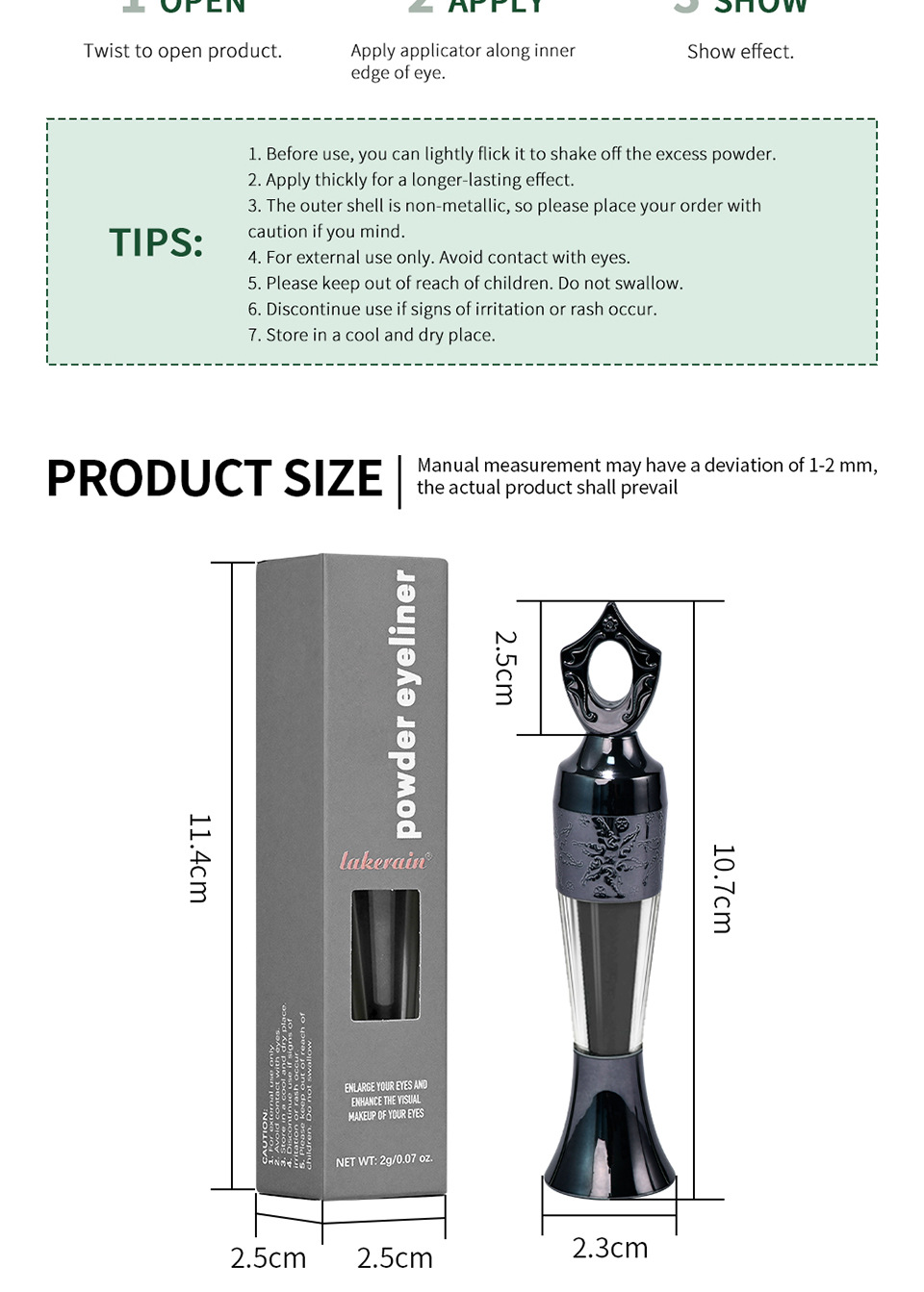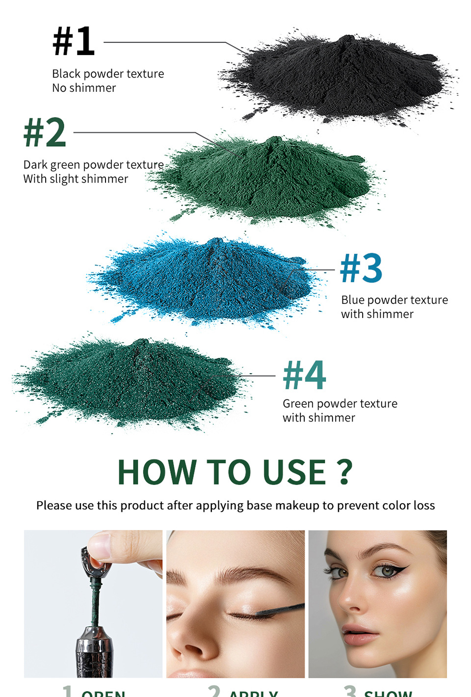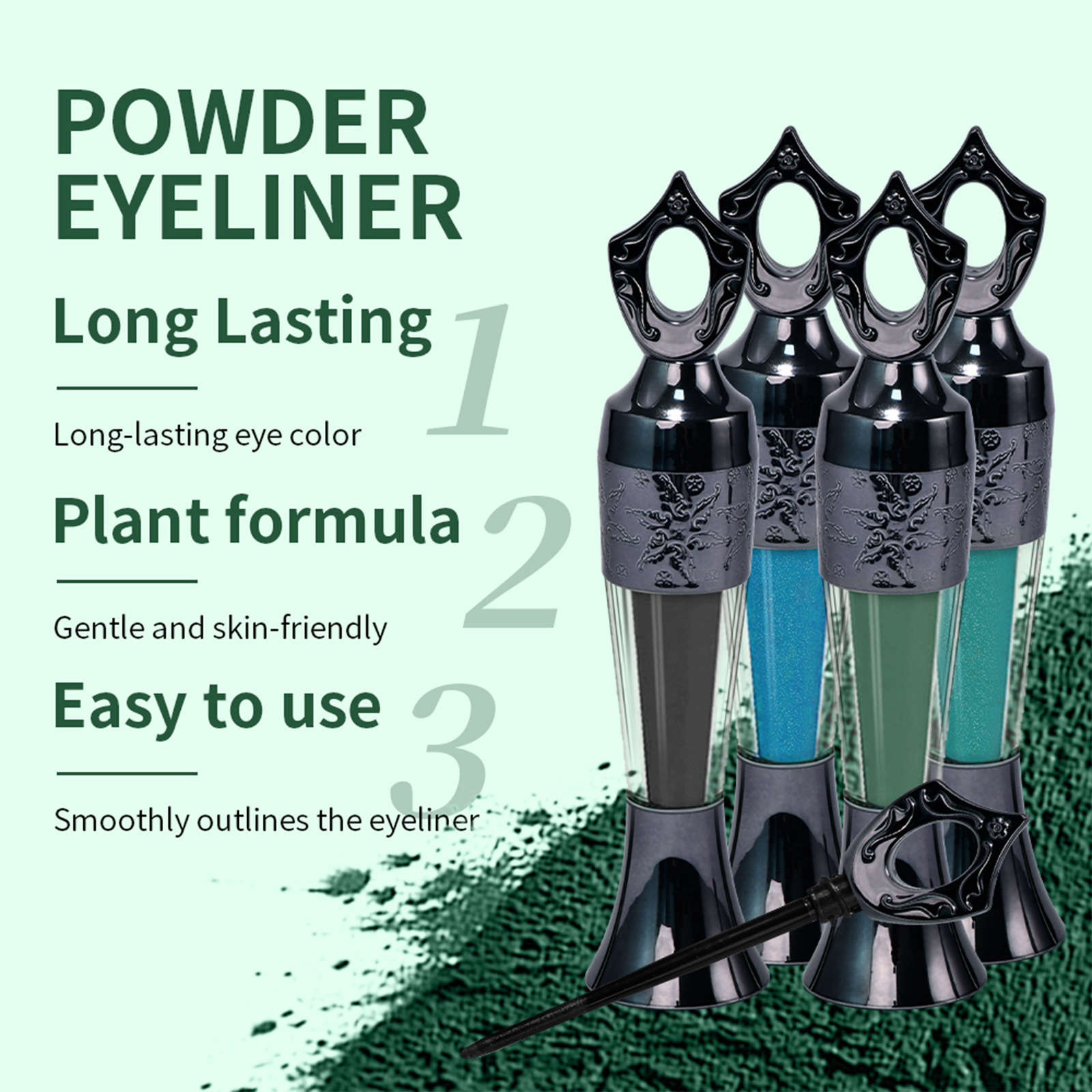 Color classification: lakerain sande powder eyeliner #1 Black (foreign edition),lakerain sande powder eyeliner #2 dark green (foreign edition),lakerain sande powder eyeliner #3 Blue (foreign edition),lakerain Sayid pink eyeliner #4 Green (Foreign version)