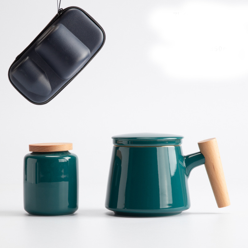 Style M: elegant cup with wooden handle + tea caddy + travel bag [malachite green],