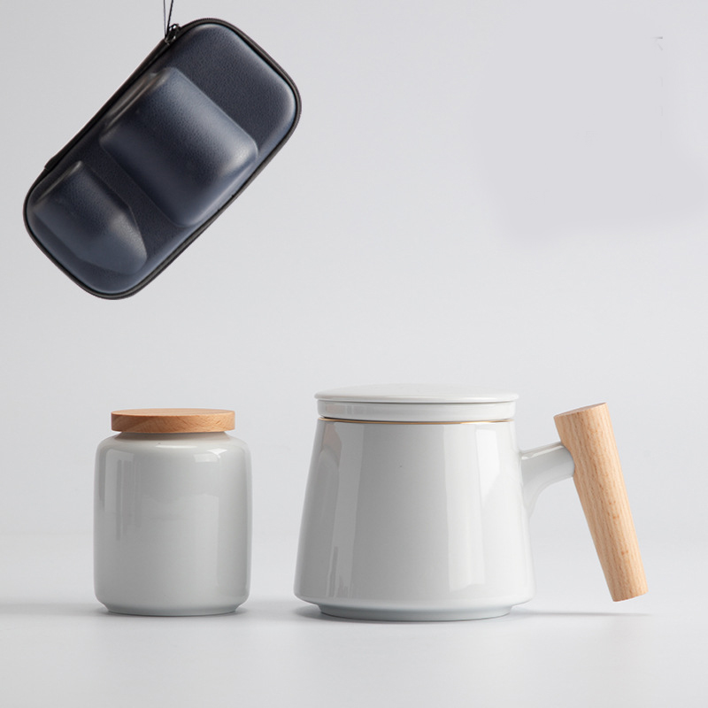 Style N: Elegant Cup with Wooden Handle + Tea Caddy + Travel Bag [Condensed White]