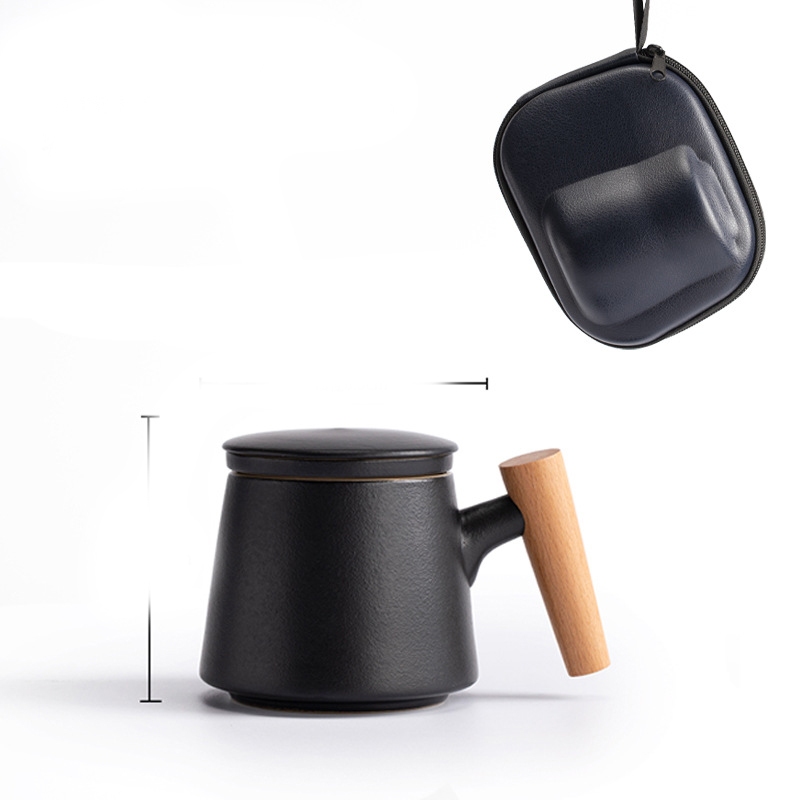 Style J: Elegant cup with wooden handle + tea caddy + travel bag [black],