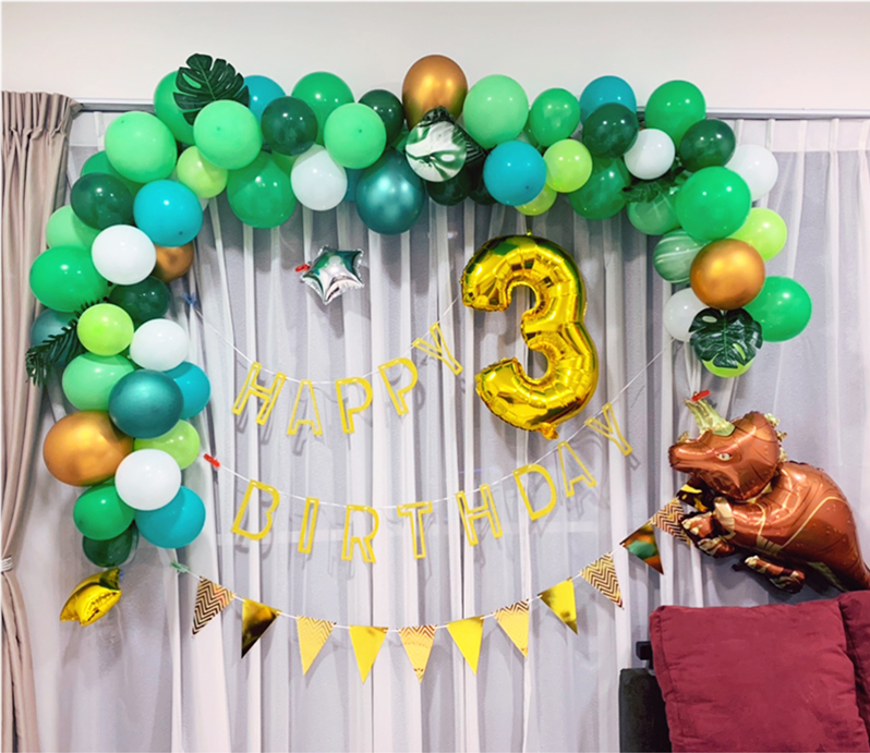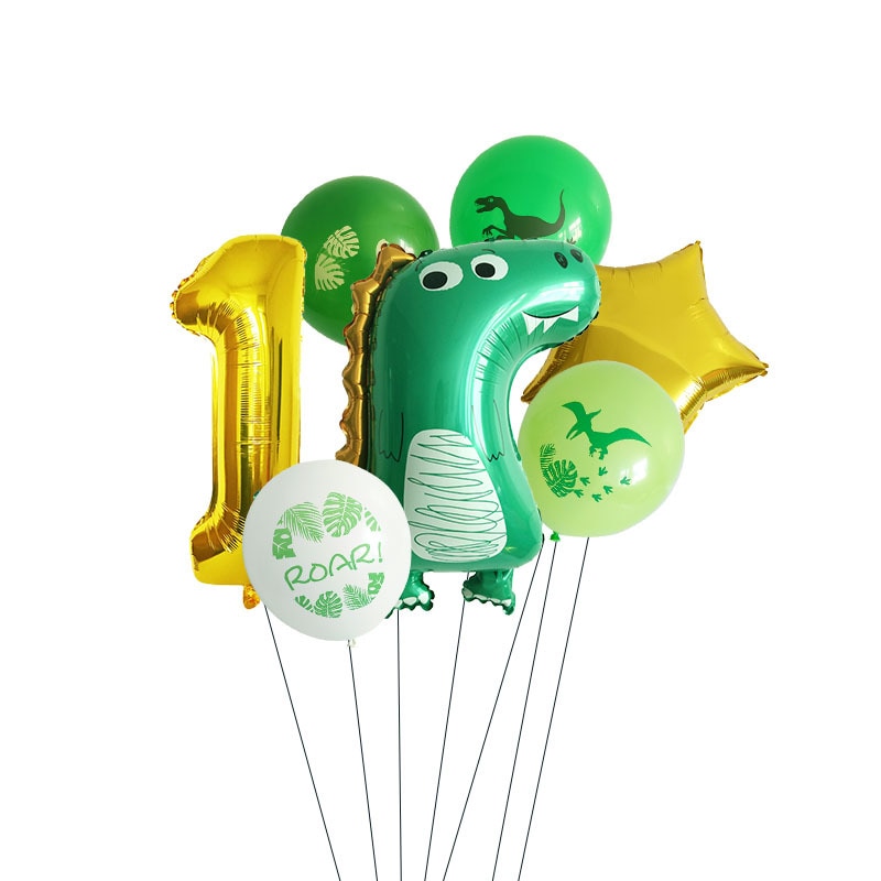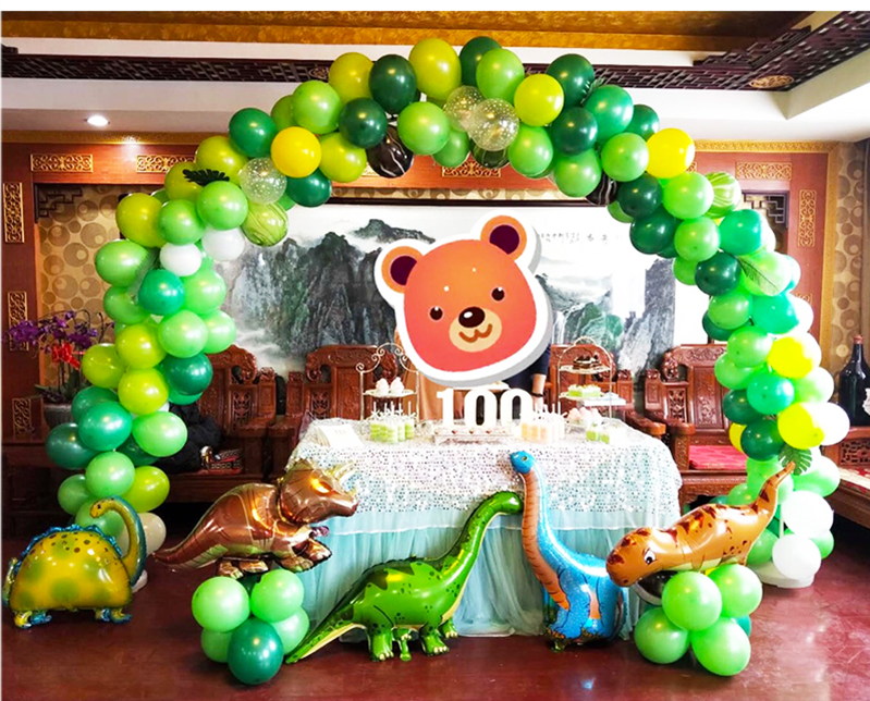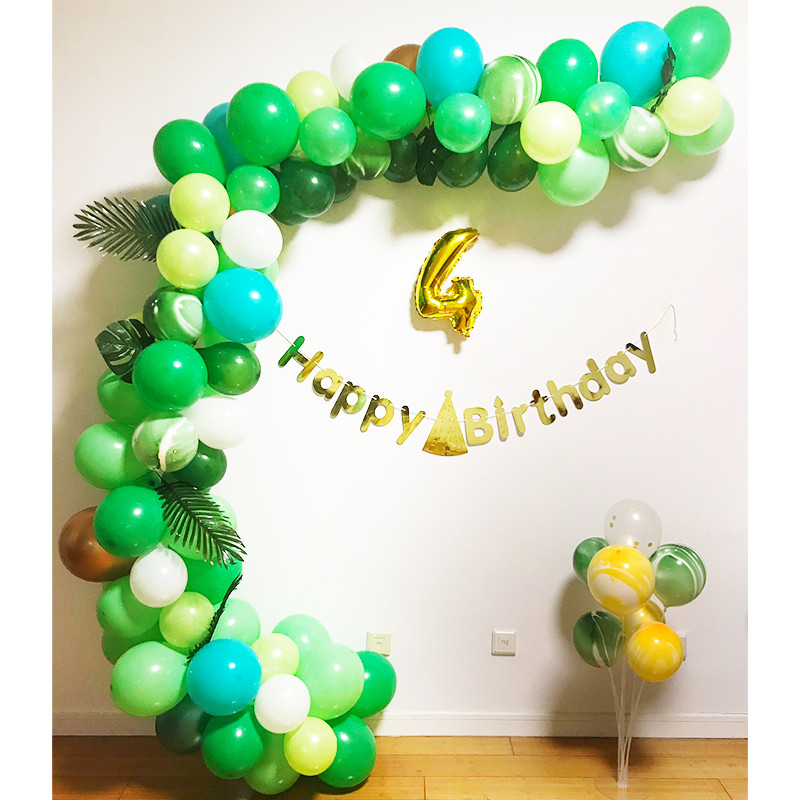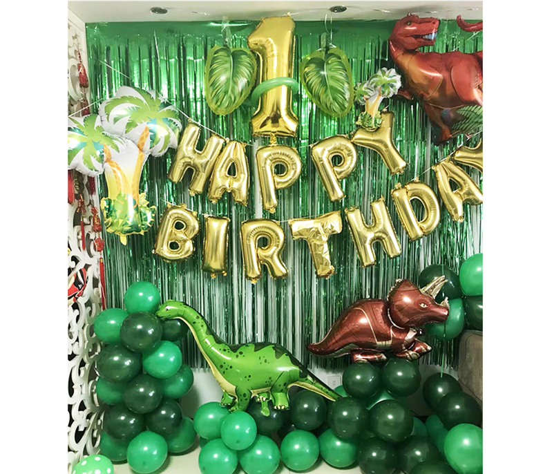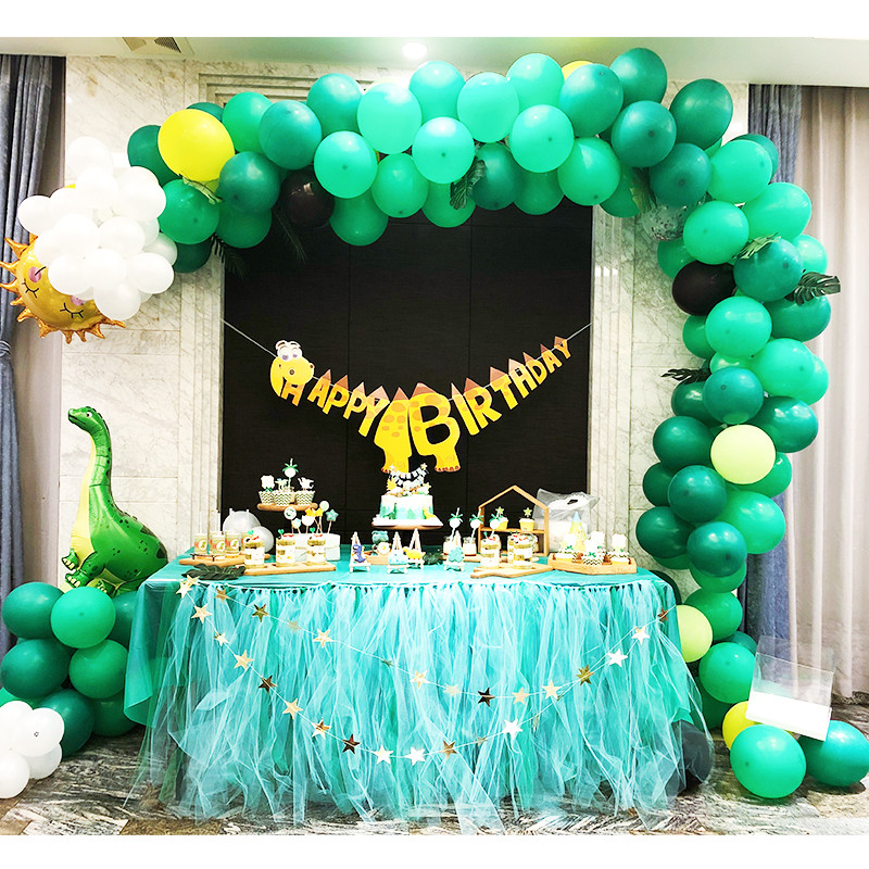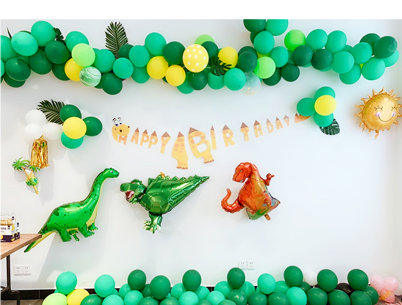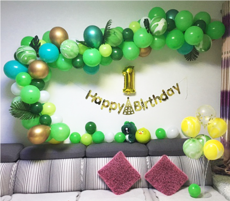 Dinosaur No. 5 package: 16-inch gold number 1, bright gold hat happy birthday flag 1, 10-inch dark green 30, dark green 20, fruit green 20, Tiffany blue 6, metallic green 2, metallic gold 4, white 5, agate green 8 , Agate yellow 4, disc gold 2, table floating bundle 1, pump 1, balloon chain 1, sticky hook 4, ribbon 1, masking glue 1