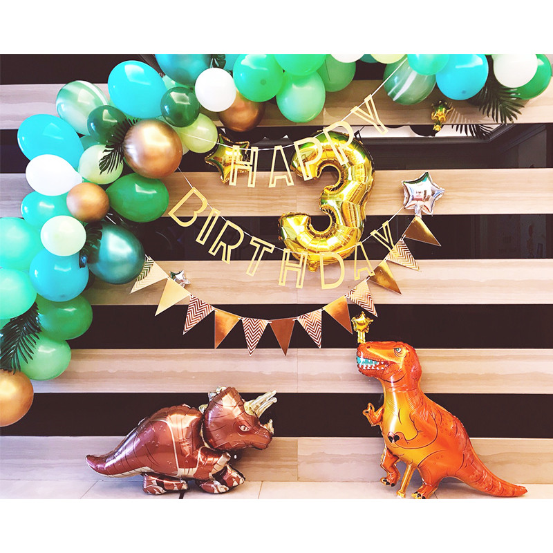 Dinosaur 2 package: hollow flashing gold happybirthday flag 1, pennant gold 1, triceratops 1, 30-inch golden number 3 (1), 10-inch star gold, 1 silver, 1 10-inch dark green, 20 fruit green 20 A white 20, metallic green 10, agate green 5, green big turtle leaf 4, green big leaf 2, balloon chain 1, pump 1, sticky hook 1, knot 1, ribbon 1, masking glue 1 , Transparent glue 1