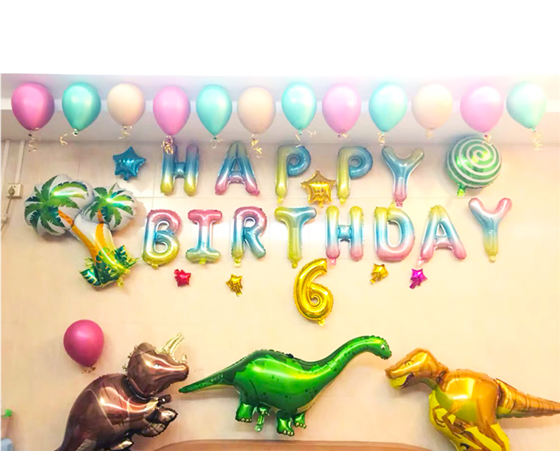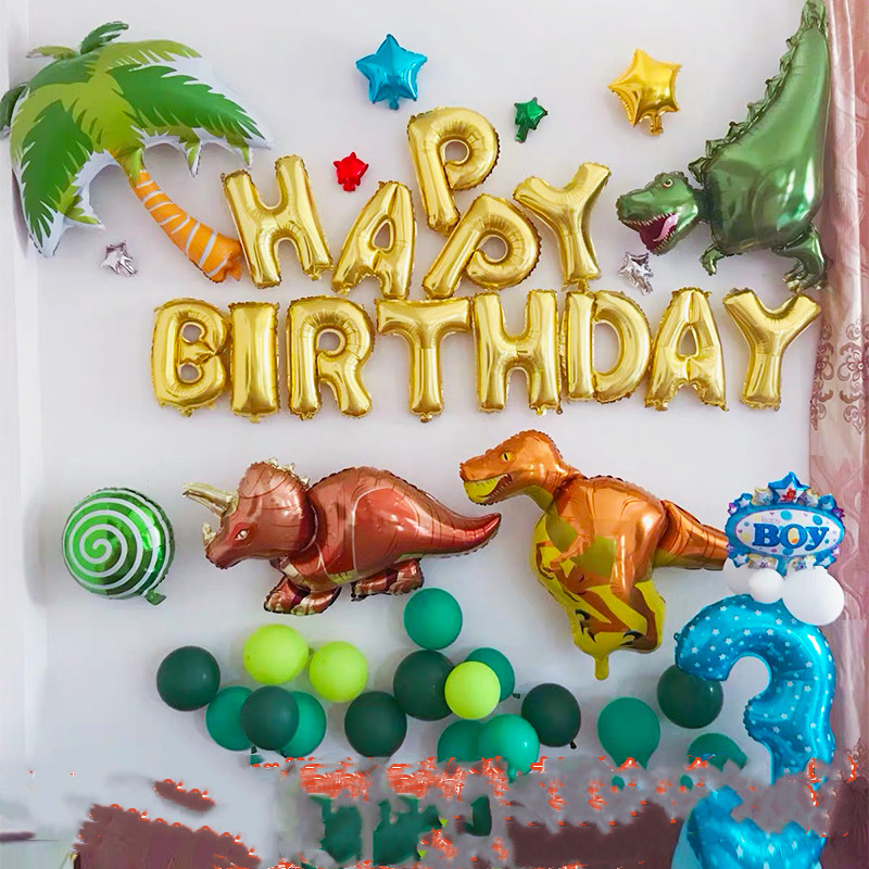 Dinosaur No. 4 package: 16-inch letter gold: a set of happybirthday, large coconut tree 1, horned dragon 1, triceratops 1, Velociraptor 1, 18-inch lollipop green 1, 10-inch star blue 1, gold 1, 5 One inch star silver, red, green, gold, 10 inch dark green 10, dark green 10, fruit green 5, digital column 3 (the crown is a convertible boy), pump 1, glue, texture glue, small transparent glue