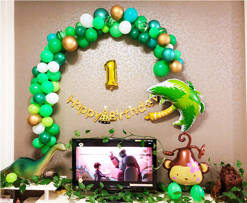 Dinosaur No. 3 Package: 1 happybirthday flag with bright gold hat, 1 walking super dragon, 1 large coconut tree, 1 flower monkey, 16-inch golden number 1 (1), 10-inch dark green 30 dark green 30 fruits Green 20 pcs, white 20 pcs, metal gold 6 pcs, agate green 6 pcs, Tiffany blue 10 pcs, balloon chain 1, pump 1, sticky hook 1, knot 1, color ribbon 1. Masking glue 1, transparent glue 1