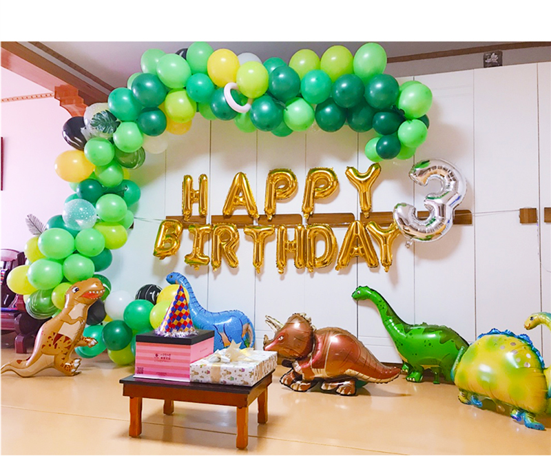 Dinosaur No. 6 Package: 16-inch letter gold: a set of happybirthday, 30-inch silver number 3 (1), 10-inch dark green 25 dark green 30 fruit green 25 white 10 yellow 5, transparent gypsophila 5 , Agate green 3, agate black 3, small turtle back leaf 2, green big leaf 2, blue long-necked dragon, 1 green long-necked dragon, 1 new tyrannosaurus yellow, 1 triceratops, thunder 1 dragon, long white balloon 3, balloon chain 1, inflator 2, glue hook 1, knot 1, ribbon 1. Masking glue 1, transparent glue 1