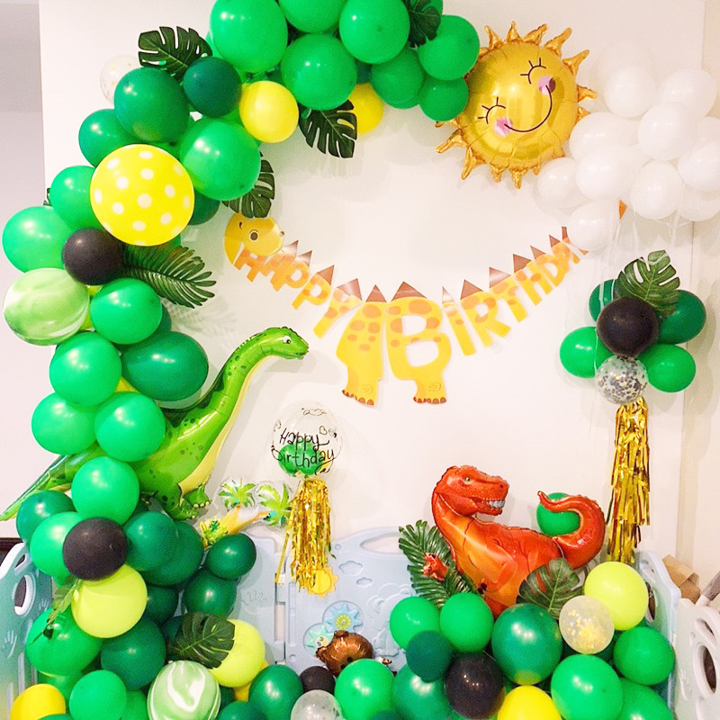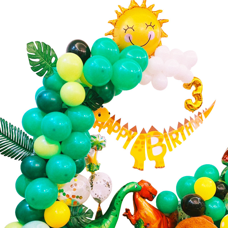 Dinosaur No. 1 Package: Yellow Dinosaur Birthday Bunting 1, Aluminum Film Golden Sun 1, 10 inches: 60 dark green, 30 dark green, 5 fruit green, 5 yellow, 5 black, 5 white, 5 agate green, 5 dots yellow, 18 inch bobo balls + 5 inch dark green 3 yellow 2 pcs + birthday sticker black 1, paper tassel gold 2 packs, disc gold 5, mini palm tree 1, orange tyrannosaurus 1, big tortoise Back leaf 8, big leaf 4, balloon chain 1, inflator 1, ribbon white 1, sticky hook 1 set, masking glue 1, knotter 1
