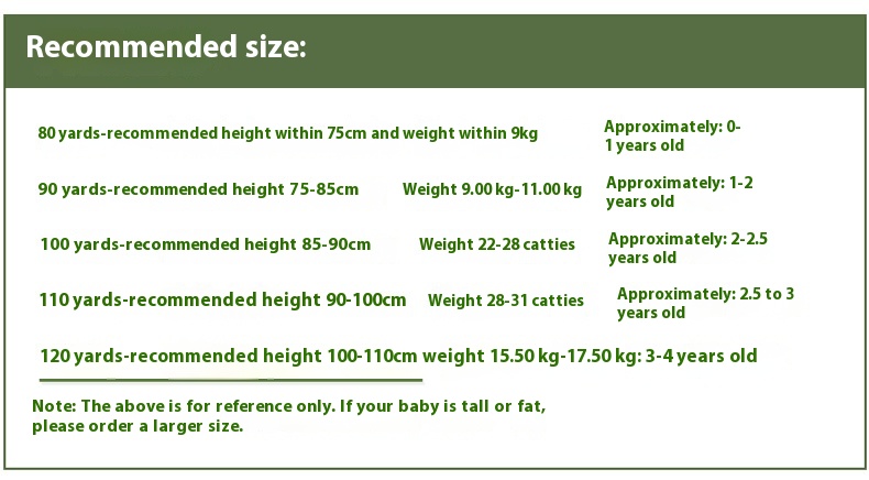 Suitable height: 80 yards recommended height below 75cm, 90 yards recommended height 75-85cm,100 yards recommended height 85-90cm,110 yards recommended height 90-100cm,120 yards recommend height 100-110cm