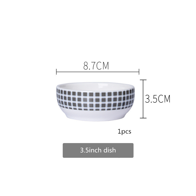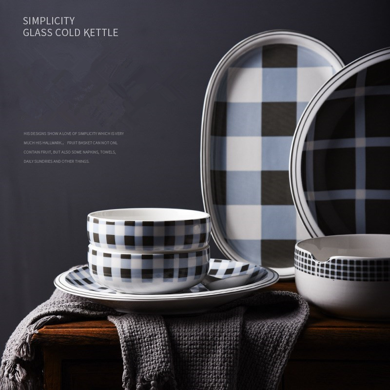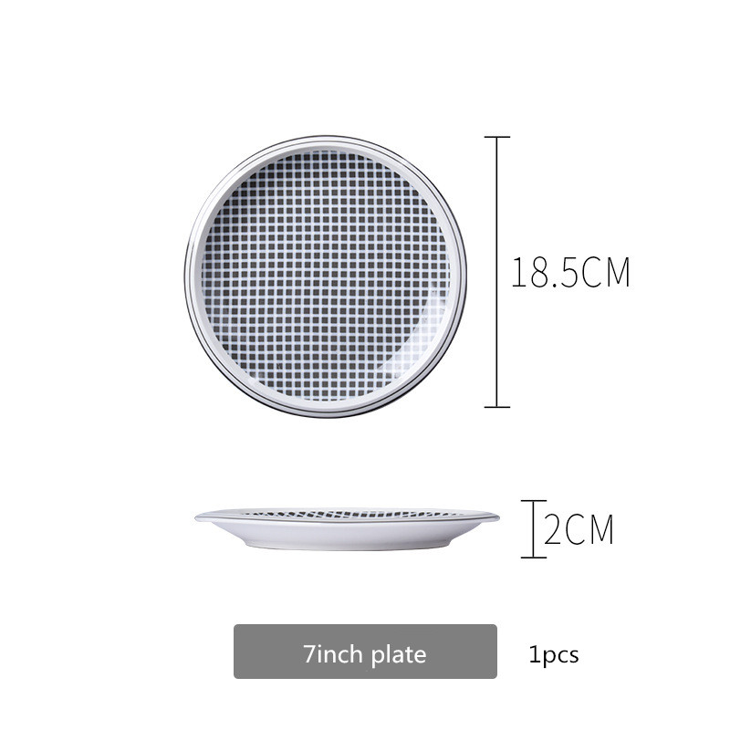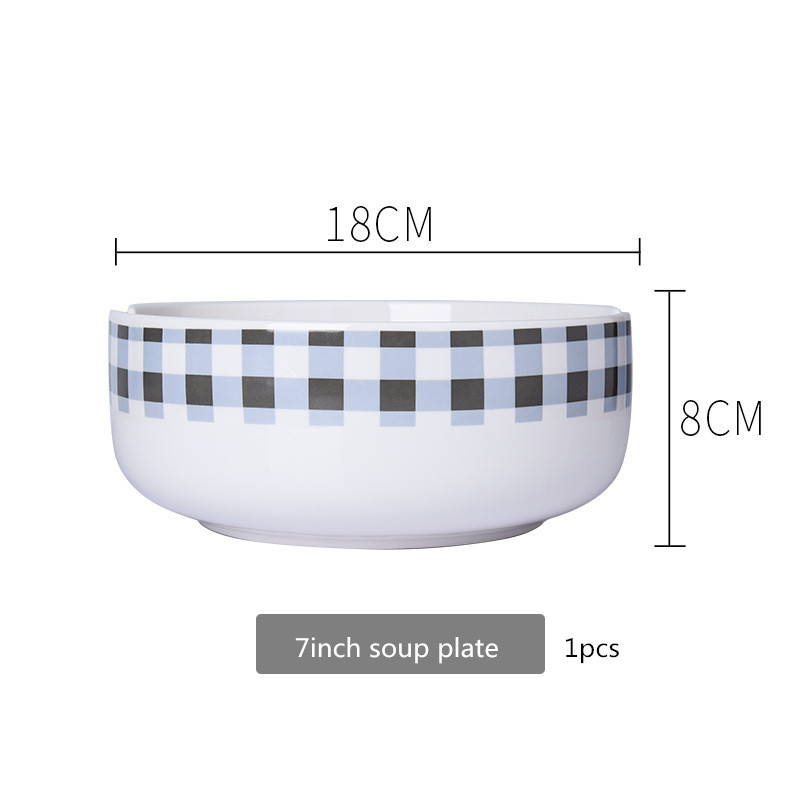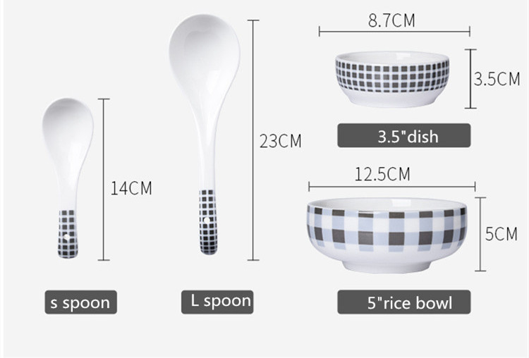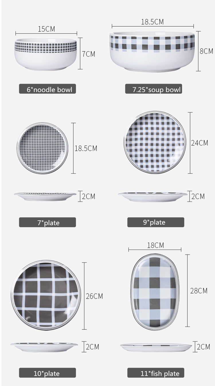 Colour: 5 inch-gray grid rice bowl gray grid-small dish gray grid-small spoon 28CM- gray grid oval plate 6 inches- gray grid noodle bowl 7 inches- gray grid soup bowl 10 inches- gray grid disc gray grid-large Soup spoon 7 inches-gray grid disc 9 inches-gray grid disc