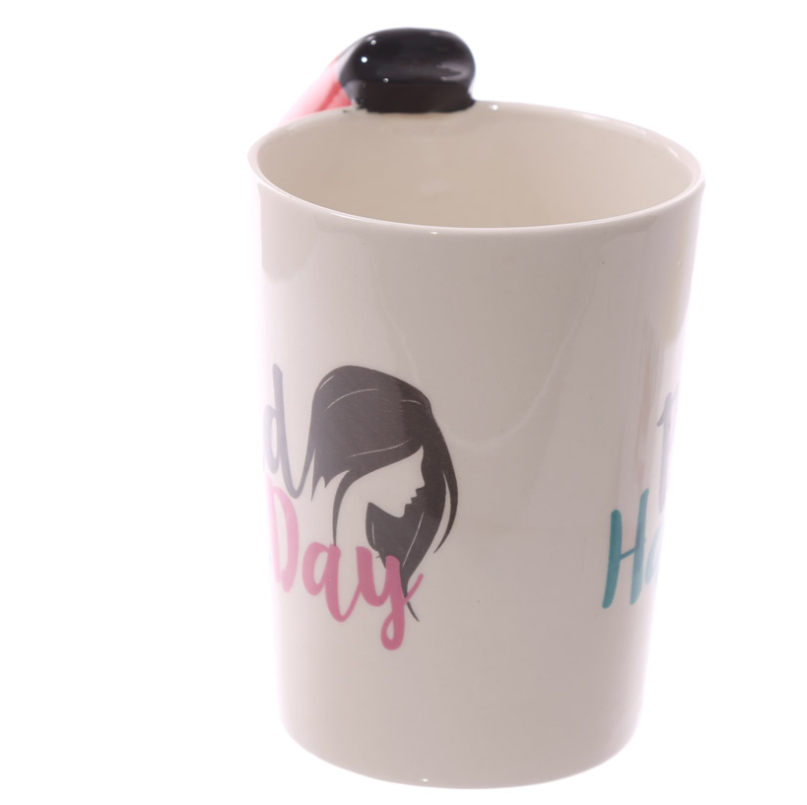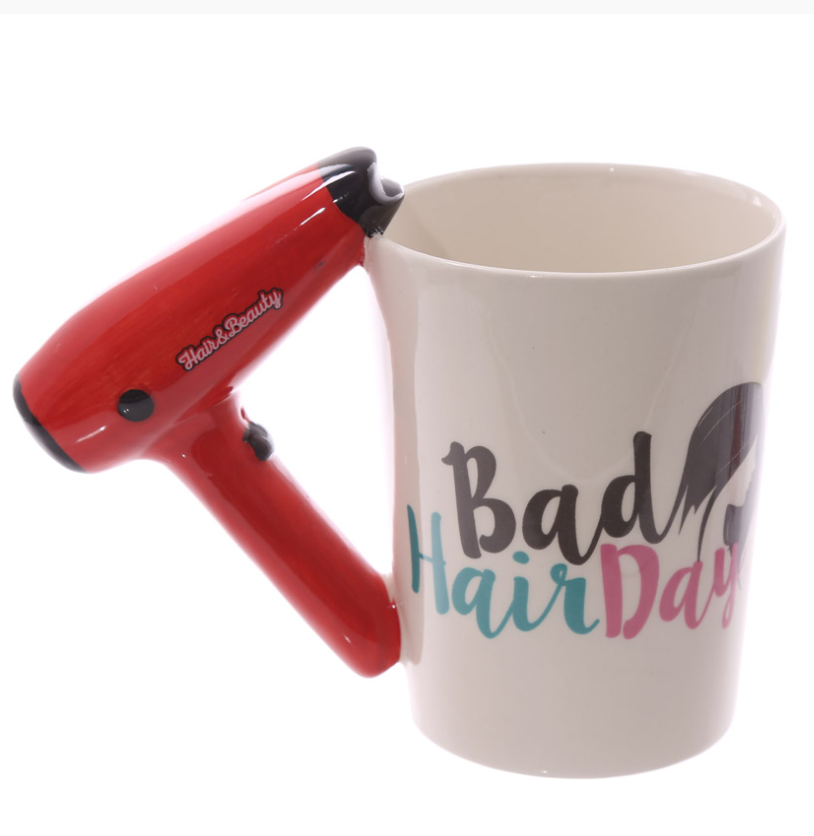 A fabulous and cute ceramic mug with a hairdryer-shaped handle.