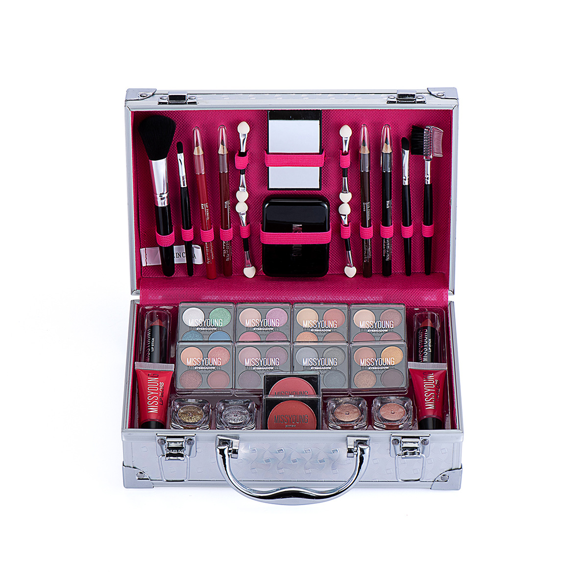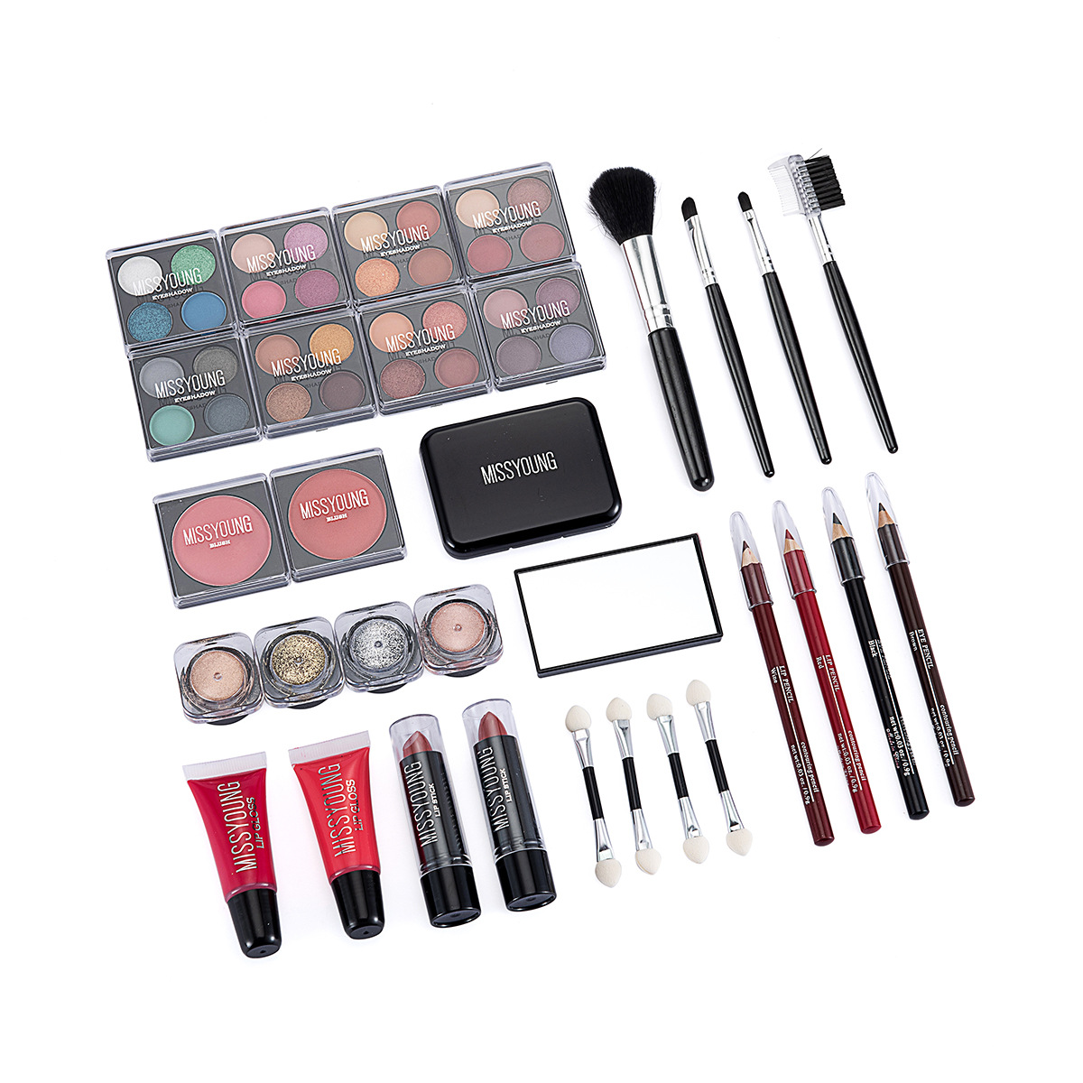 Set includes: lipstick, lip gloss, eye shadow, mascara, blush, lip pencil, brush, etc.