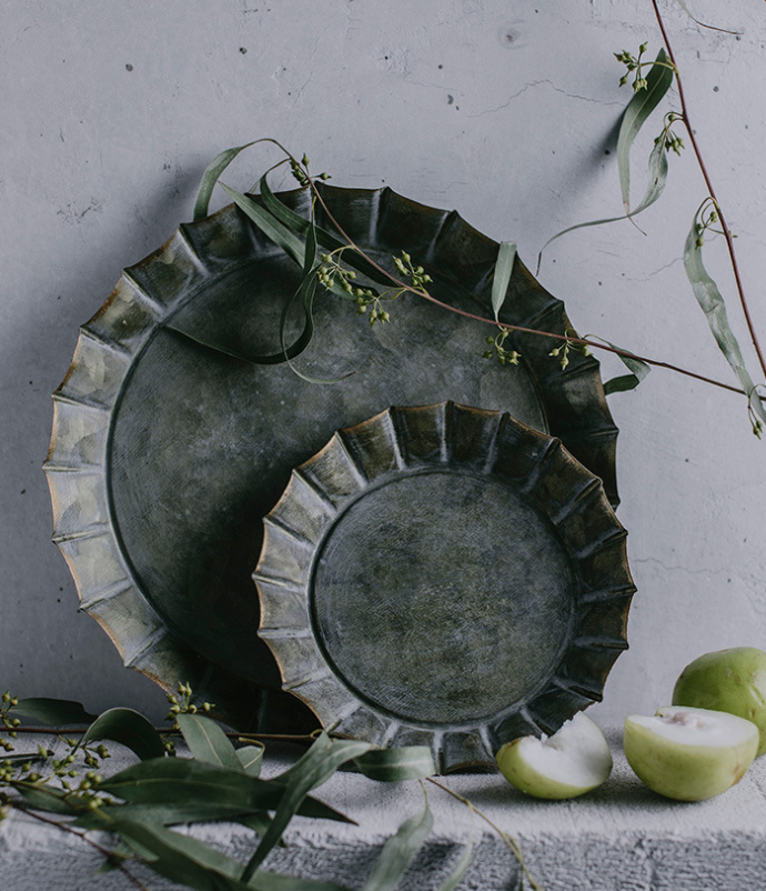 Iron products, unique lace design, durable, simple, beautiful and distinctive. It can be used as a storage tray and holds bread, dried fruits and other miscellaneous goods.