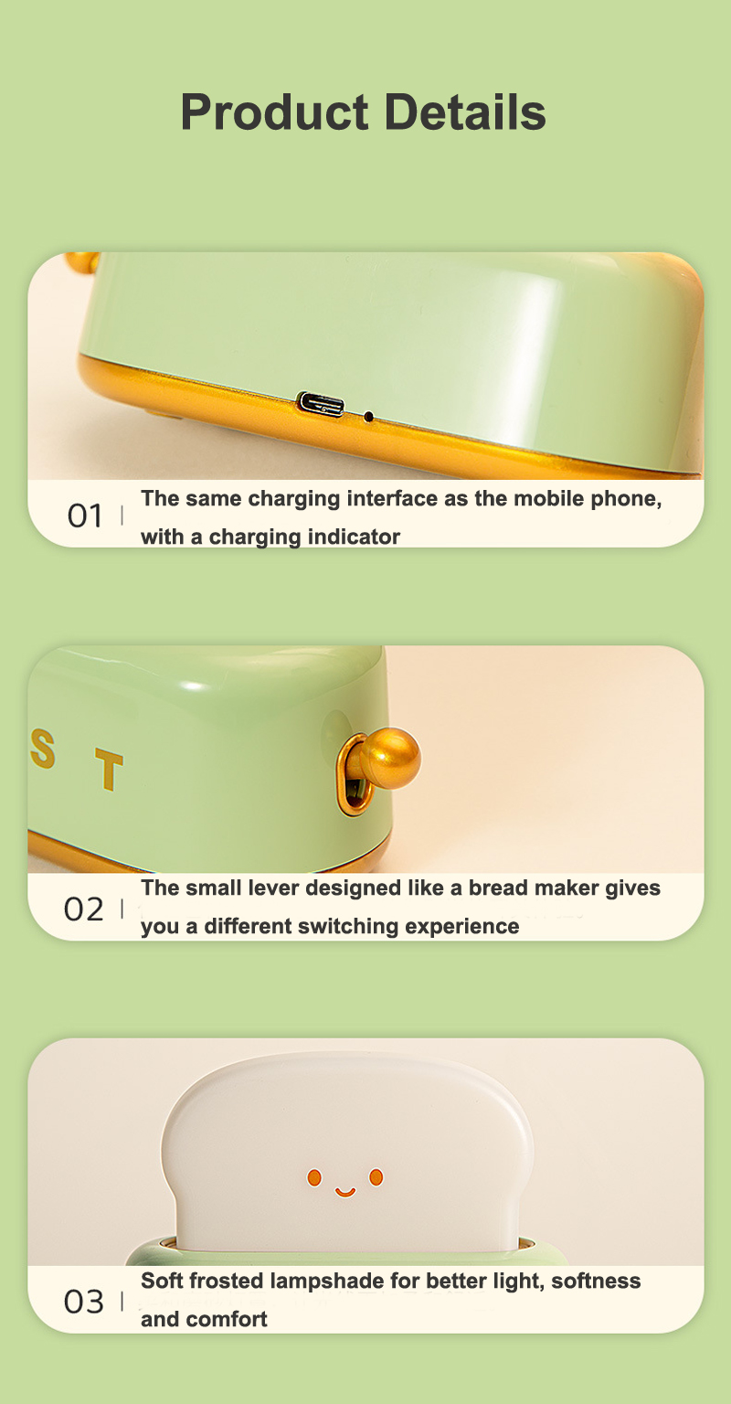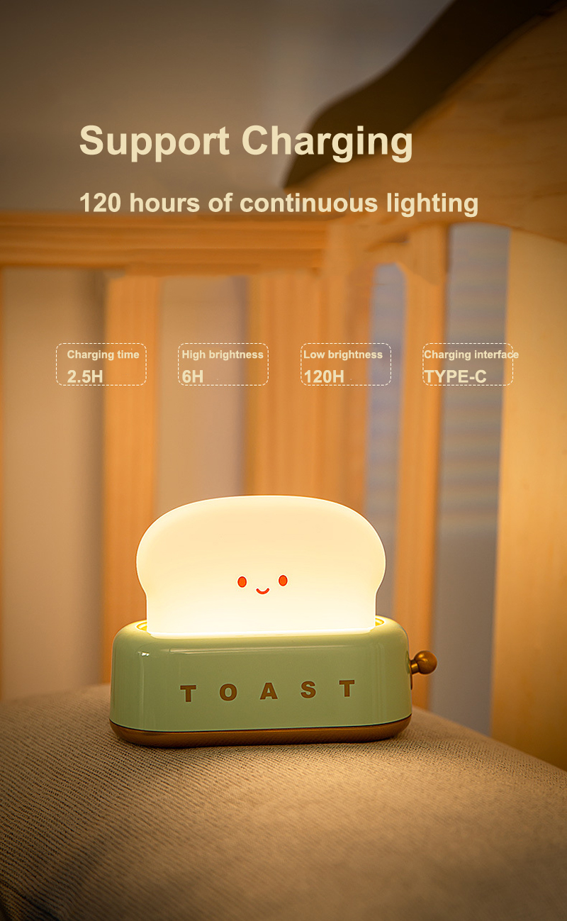 【PORTABLE USB RECHARGEABLE】The night light has a built-in 800mAh rechargeable battery, which is portable and lasts for a long time. The toaster lamp is small and lightweight, which means you can easy to carry it wherever you go, suitable for college dorms, bedrooms and room decor.