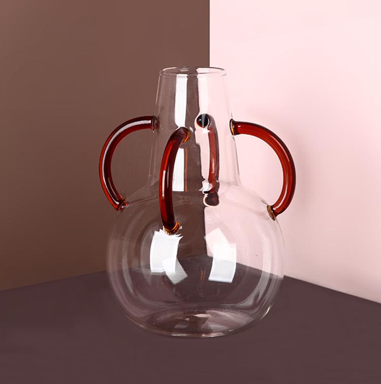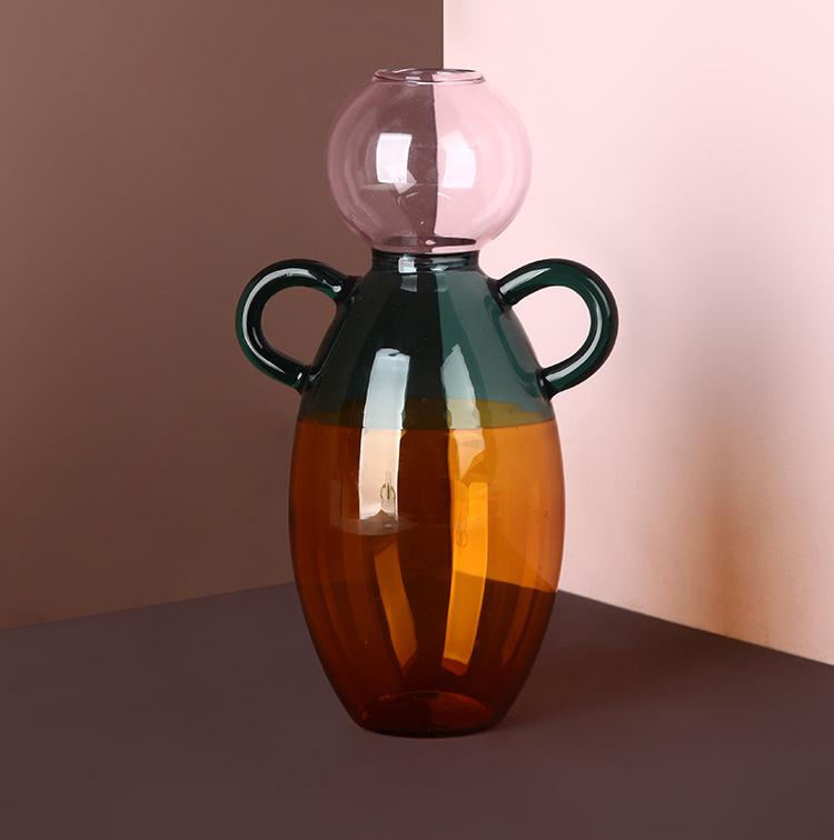 Color: Green glass vase with handle (13.5*11cm), amber glass vase with handle (17*13cm), stained glass double-ear vase (19*11cm)