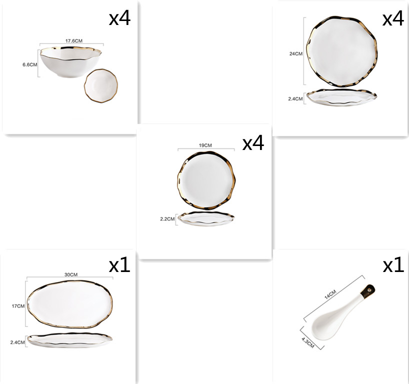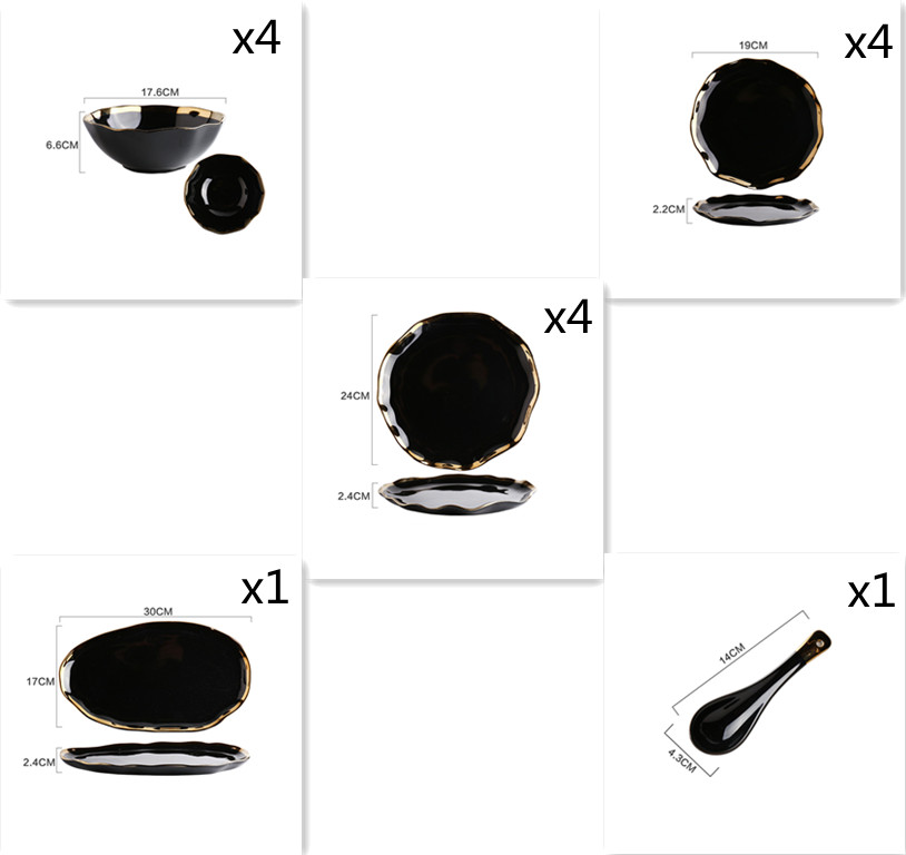 Color 5 inch rice bowl (black), 5 inch rice bowl (white), 7 inch salad bowl (black), 7 inch salad bowl (white), 8 inch soup bowl (black), 8 inch soup bowl (white), 7 Inch shallow dish (black), 7 inch shallow dish (white), 7 inch deep dish (black), 7 inch deep dish (white), 10 inch shallow dish (black), 10 inch shallow dish (white), 12 inch fish Plate (black), 12-inch fish plate (white), Wei plate (black), Wei plate (white), small soup spoon (black), small soup spoon (white)