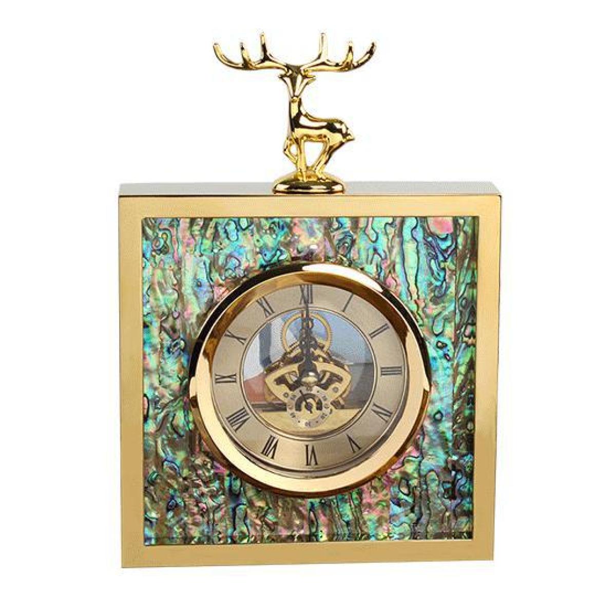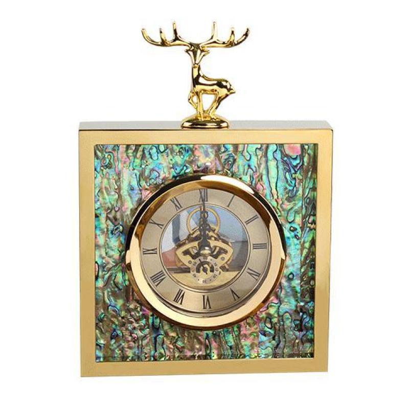 Creative square stainless steel metal golden deer head abalone shell clock clock pendulum model room decoration 16*16*24.5 thickness 4cm